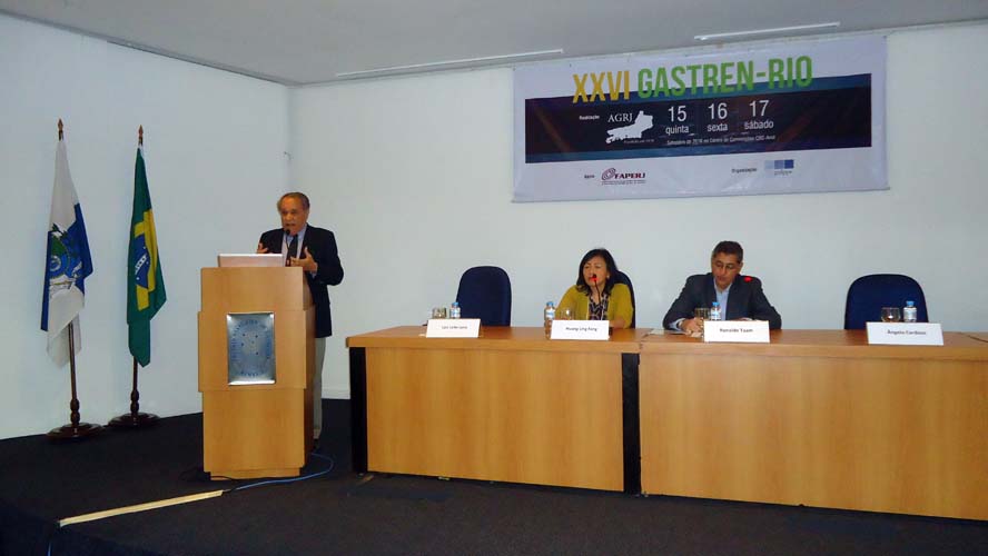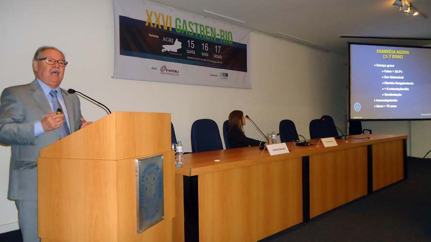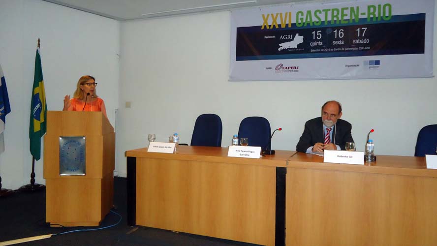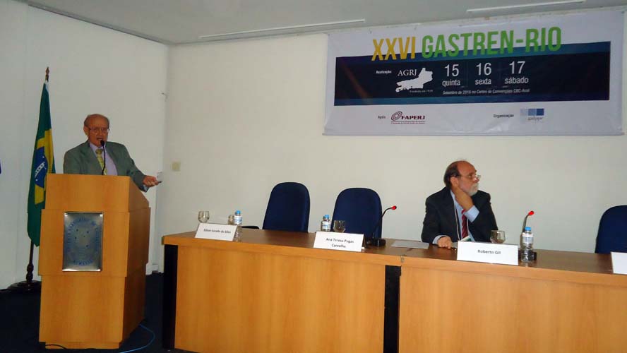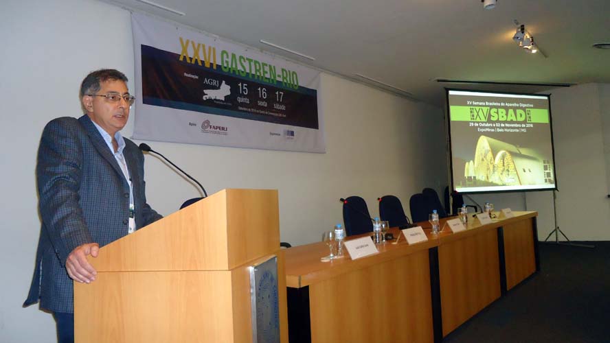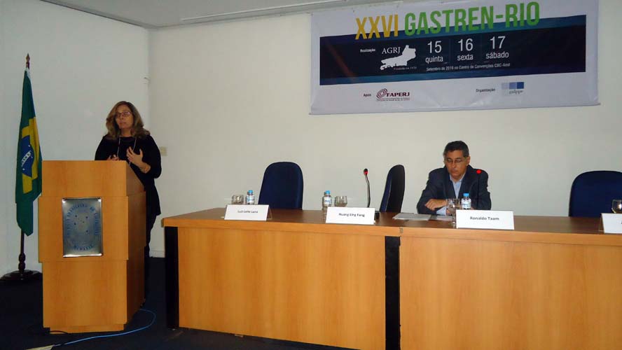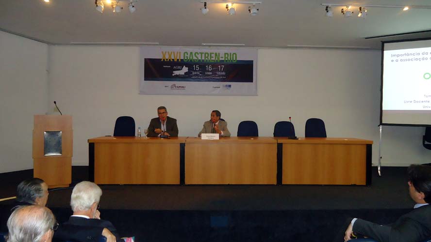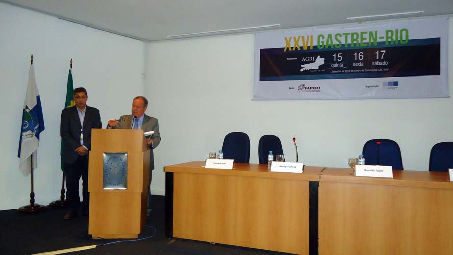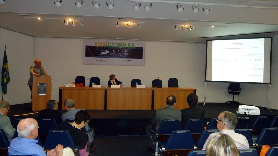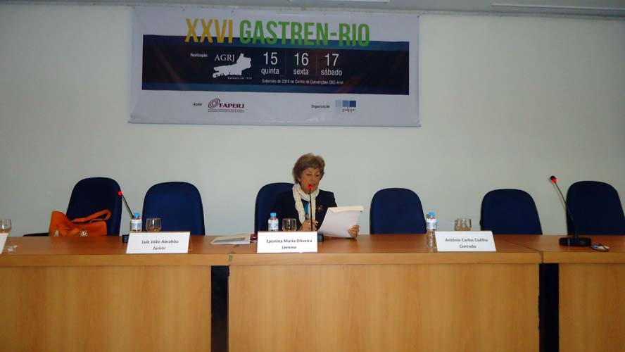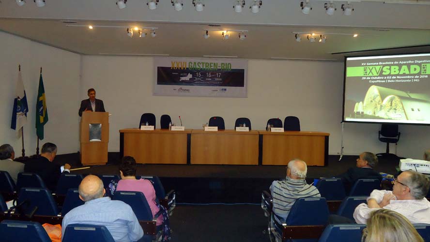 Depois do intervalo para o café, foi a vez da conferência sobre Microbiota Intestinal, com a Dra. Maria do Carmo Friche Passos sendo a conferencista e o Dr. Javier Flores Morelli o presidente. Após um breve debate, o Dr. José Galvão-Alves prestou uma homenagem a Dra. Maria Friche Passo falando da importância dela para a Gastroenterologia nacional.