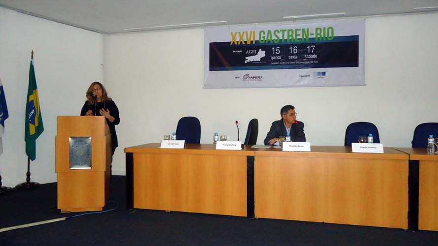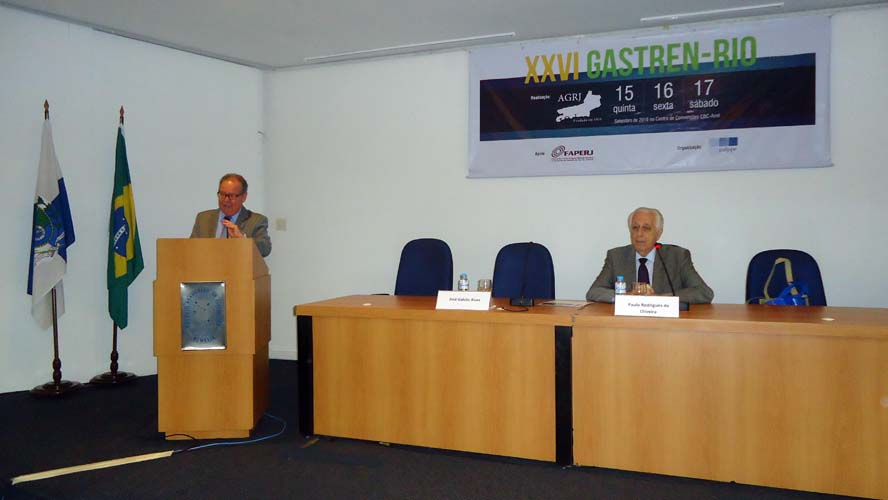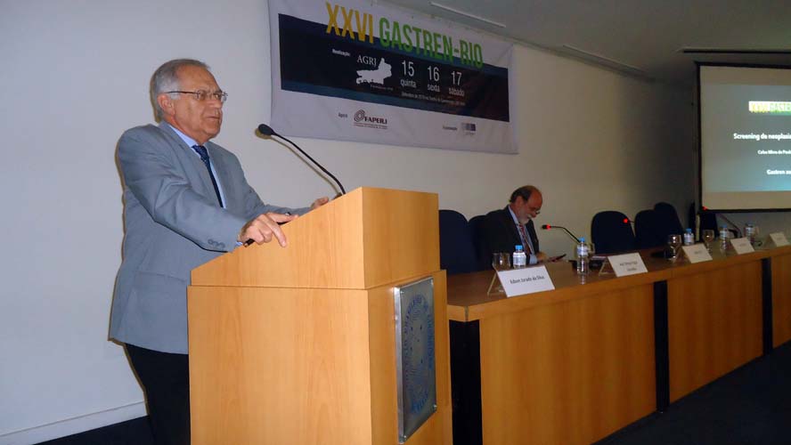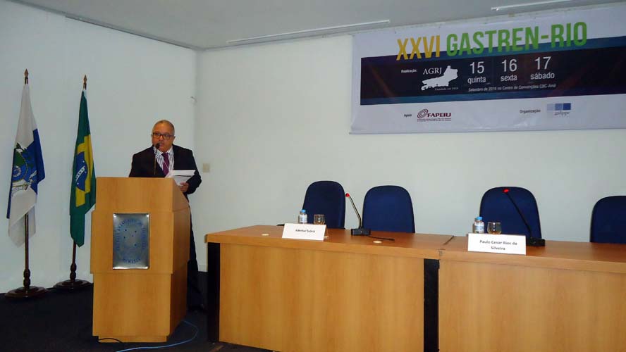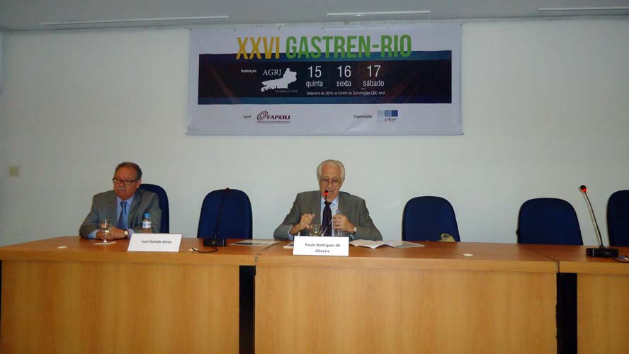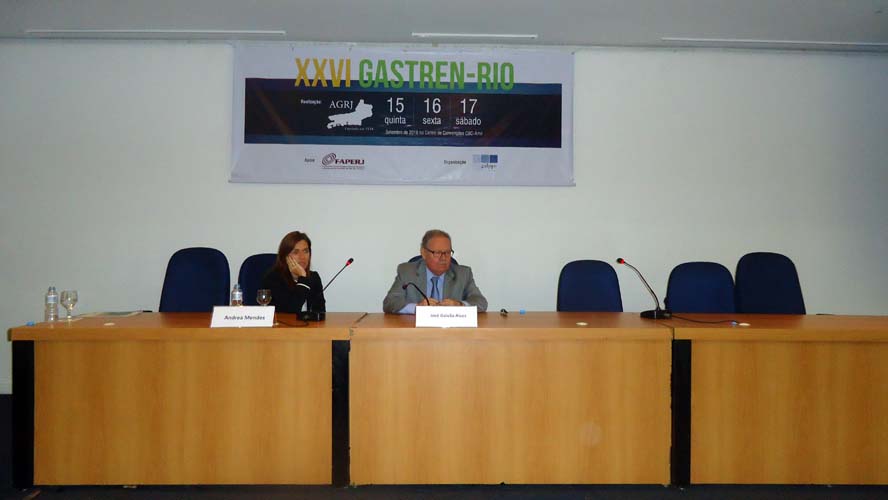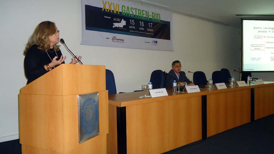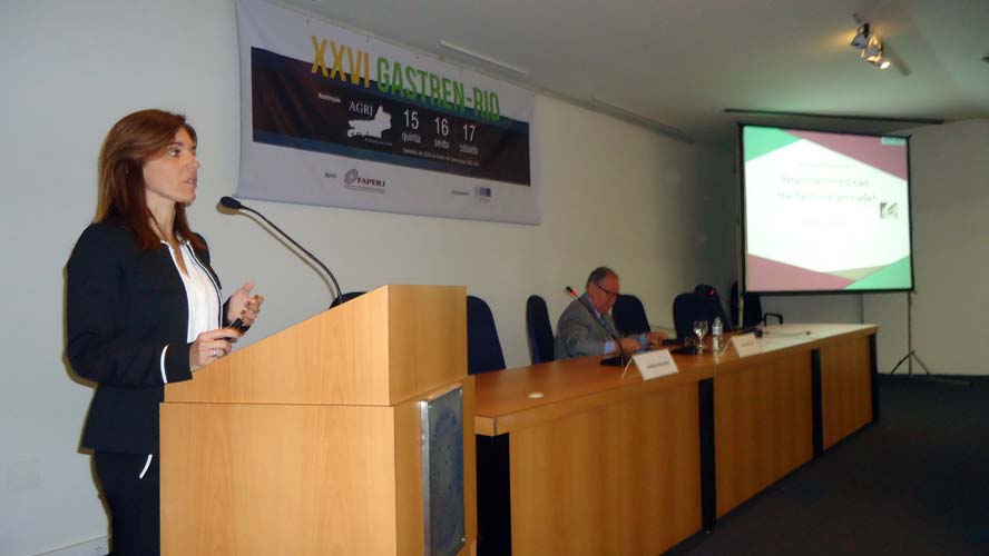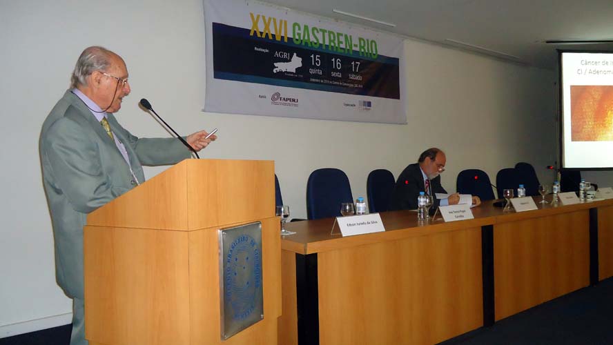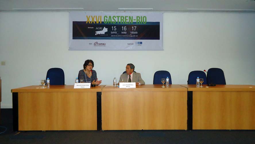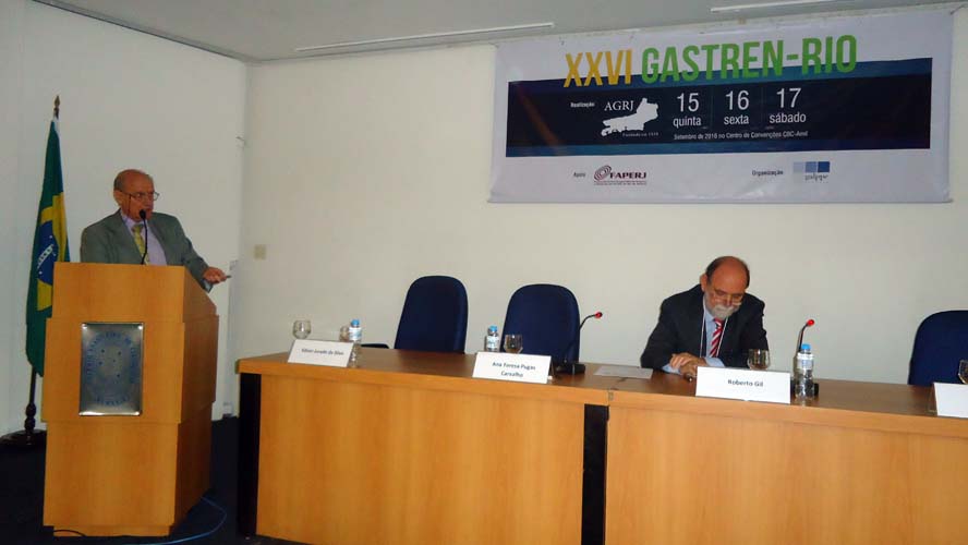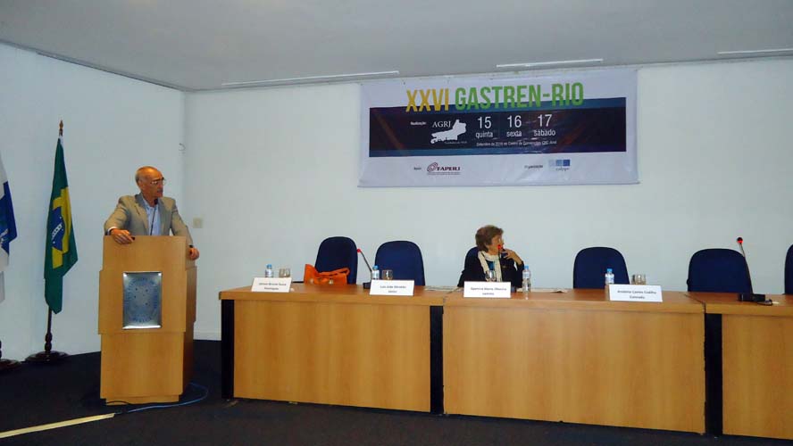 Depois do intervalo para o café, foi a vez da conferência sobre Microbiota Intestinal, com a Dra. Maria do Carmo Friche Passos sendo a conferencista e o Dr. Javier Flores Morelli o presidente. Após um breve debate, o Dr. José Galvão-Alves prestou uma homenagem a Dra. Maria Friche Passo falando da importância dela para a Gastroenterologia nacional.
