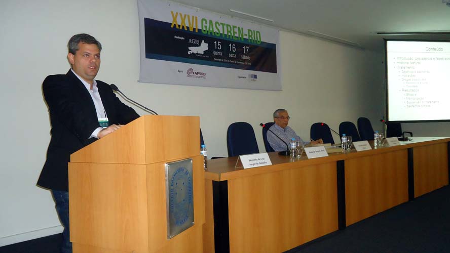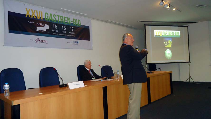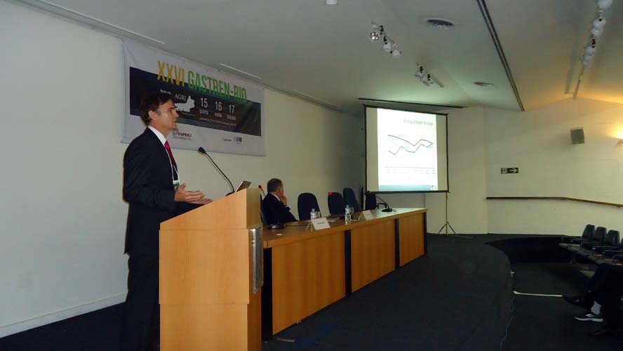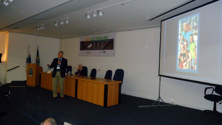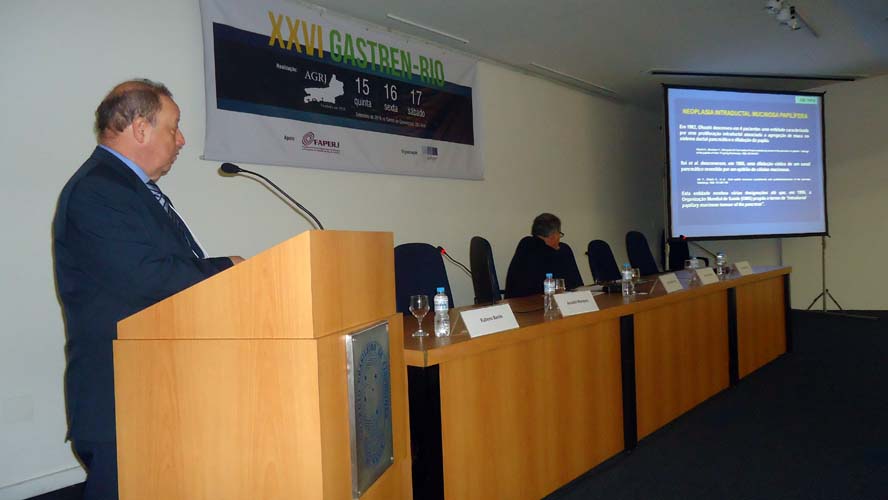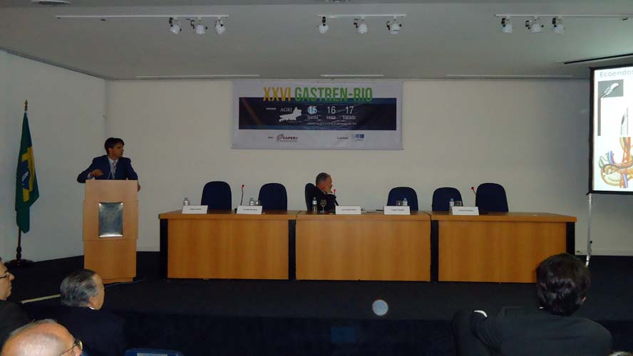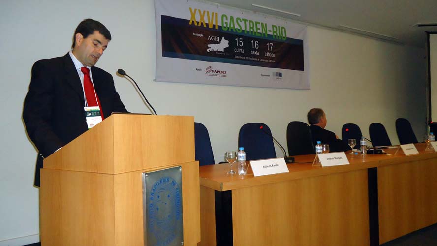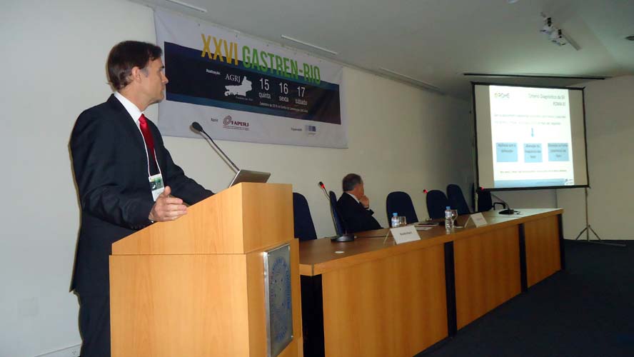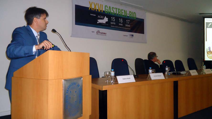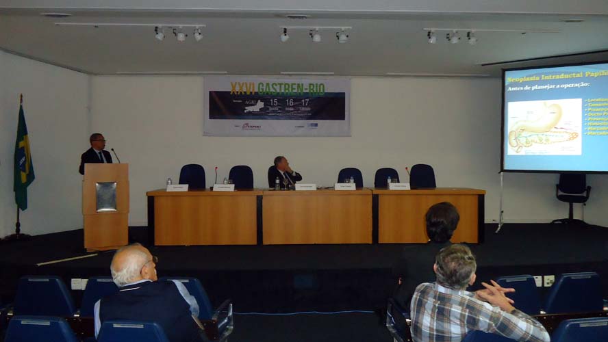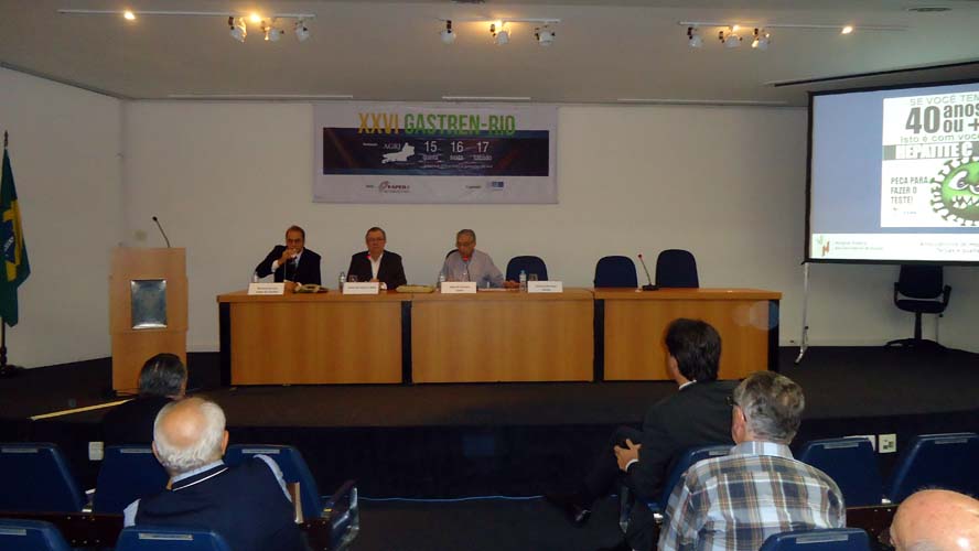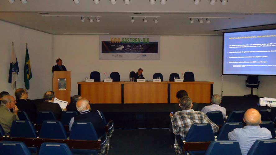Após um intervalo para o Gastrolanche, os conferencistas voltaram ao auditório A do CBC para a conferência de Síndrome do Intestino Irritável – Roma IV, ministrada pelo Dr. Ricardo Alvariz e presidida pelo Dr. José Galvão-Alves que, após o término da conferência, continuou no palco para comandar a mesa-redonda sobre Neoplasia Intraductal Mucinosa Papilífero (NIMP), que contou com apresentações sobre Definição e Classificação, com o Dr. Rubens Basile, Diagnóstico por imagem, com o Dr. Antonio Siciliano, Ecoendoscopia, com o Dr. Thiago Tatagiba, e Cirurgia, com o Dr. Arnaldo Marques. Encerrando a mesa-redonda houve um debate por cerca de dez minutos com os presentes.