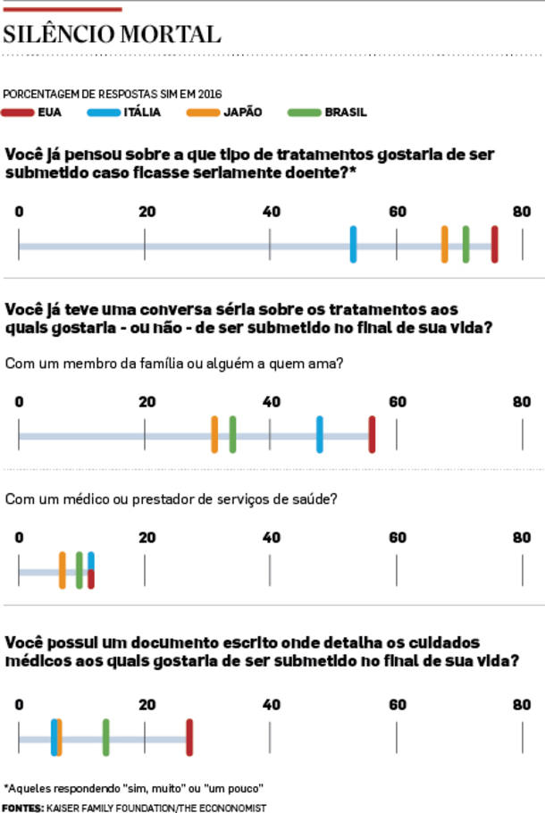 A enorme distância entre o que as pessoas esperam dos médicos quando a morte se aproxima e a realidade do tratamento que recebem fica nítida em pesquisa conduzida por The Economist, em parceria com a Kaiser Family Foundation. O levantamento aconteceu em quatro países com diferentes realidades demográficas, tradições religiosas e níveis de desenvolvimento: EUA, Brasil, Itália e Japão. Os entrevistados responderam a um conjunto de questões sobre a morte e os “cuidados de fim de vida”. A maioria havia perdido algum familiar ou amigo próximo nos últimos cinco anos.