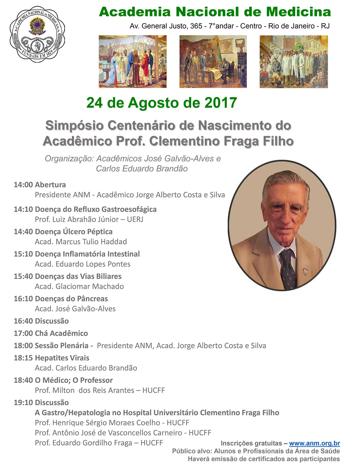 Academia Nacional de Medicina sedia, no dia 24, o Simpósio Centenário de Nascimento do Acadêmico Prof. Clementino Fraga Filho