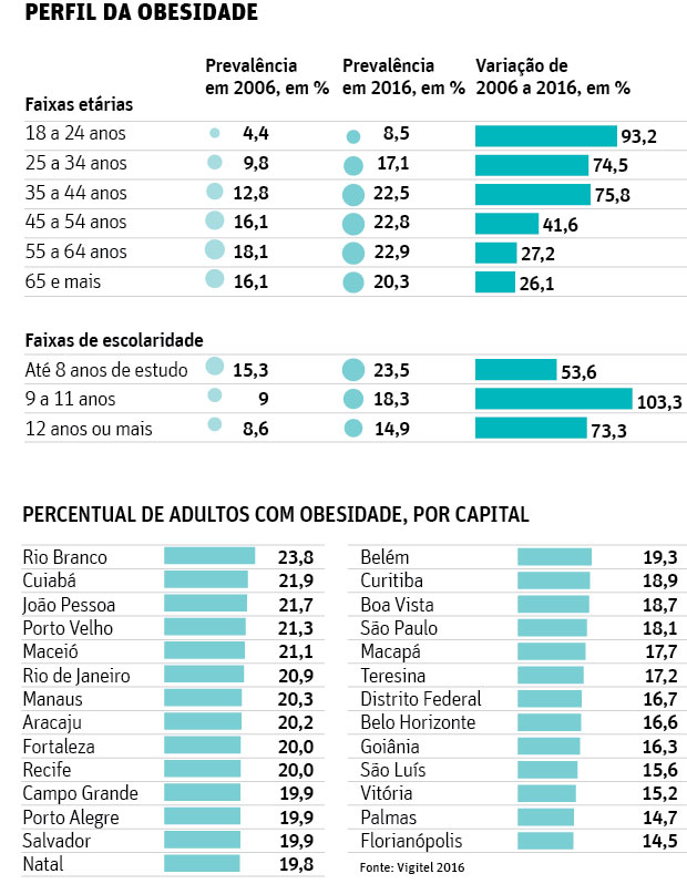 Hoje, mais de metade da população adulta está acima do peso ideal. E cerca de um em cada cinco são obesos, casos em que o IMC (índice de massa corporal) é igual ou maior que 30 kg/m². O índice cresceu 60% desde 2006, quando a pesquisa começou a ser feita nas capitais.
