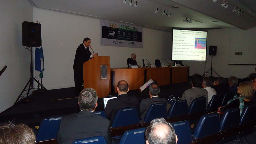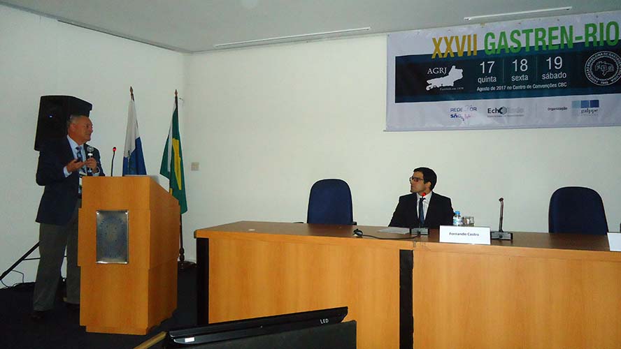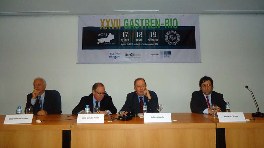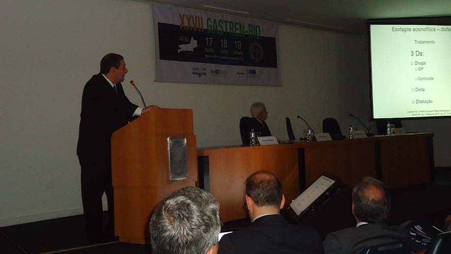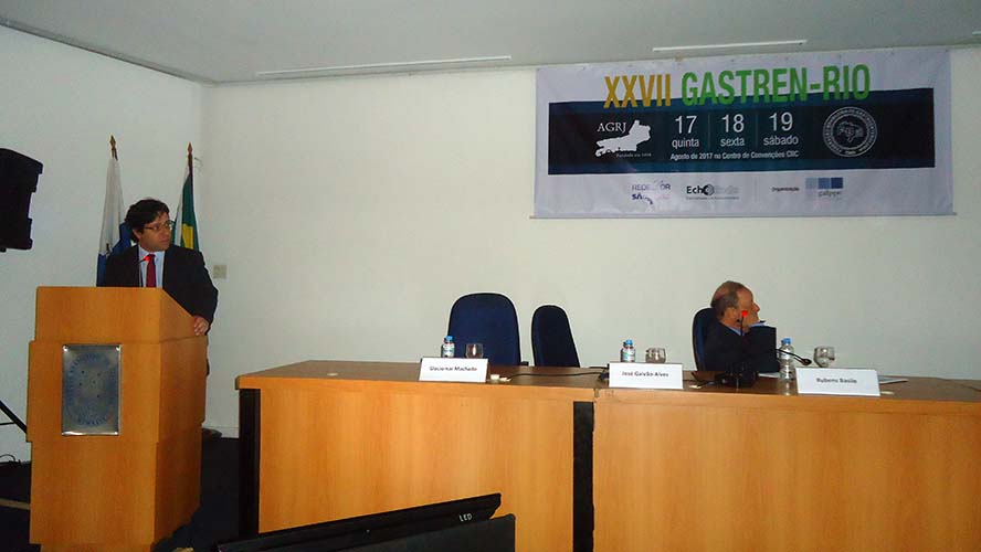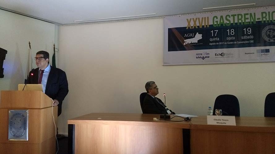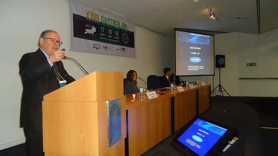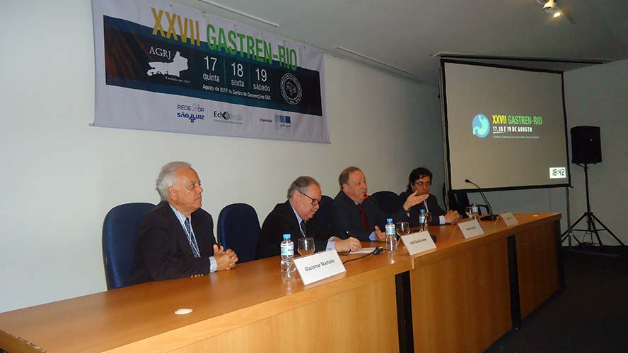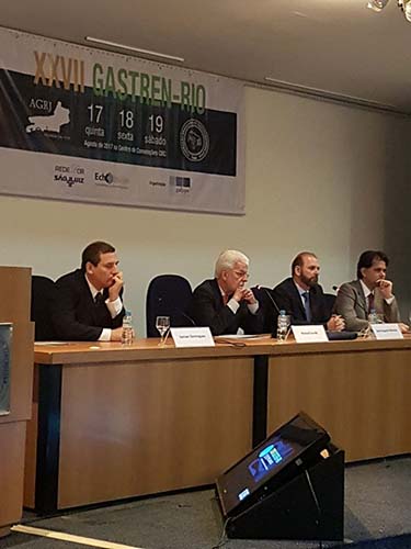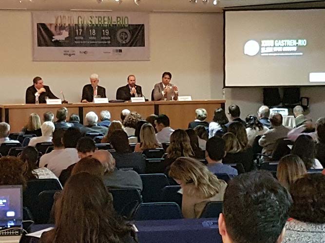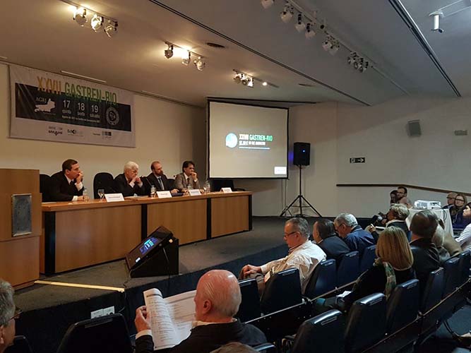 Na sequência, o tema Disfagia foi abordado em mesa redonda, com a moderação do Dr. José Augusto Messias. O palestrante Dr. Richard Gurski falou sobre disfagia pós-cirurgia anti-refluxo e como manejar. Já o Dr. Gerson Domingues discutiu a disfagia na esofagite eosinofílica. Para finalizar, o Dr. Luiz João Abrahão Júnior apontou os avanços na investigação da disfagia e trouxe alguns resultados obtidos no Hospital da UFRJ, em que atua. Ao fim da mesa redonda, todas as perguntas do auditório foram debatidas. Os dois primeiros palestrantes vieram de Porto Alegre e Belo Horizonte, respectivamente, para participarem do XXVII Gastren-Rio.
