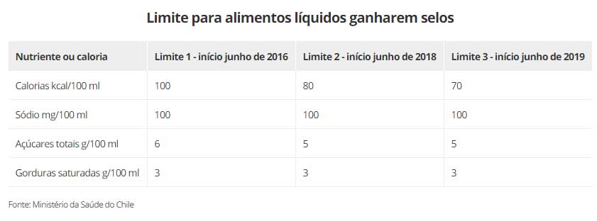No início, a lei previa um limite de sódio, açúcar, gordura saturada e calorias por 100g de alimentos menor do que está em vigor atualmente para poderem permanecer sem os selos. No entanto, devido à necessidade de adequação da produção, foi necessário estabelecer um calendário para redução gradual até 2019.