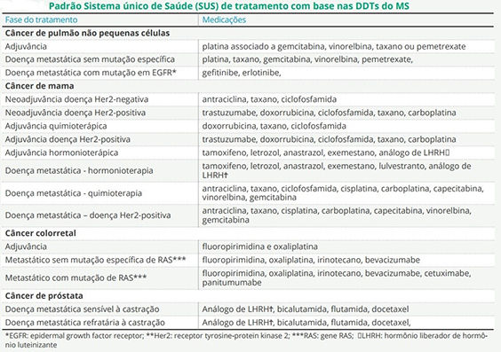 Os autores compararam o padrão de tratamento de cada centro oncológico às Diretrizes Diagnósticas e Terapêuticas (DDTs) estabelecidas pelo Ministério da Saúde (MS). O objetivo, segundo Vanessa, foi avaliar quais centros praticavam o preconizado pelo MS e quais estavam acima ou abaixo desse padrão. A imagem a seguir resume os esquemas recomendados nas DDTs e usados como padrão na pesquisa para as quatro neoplasias. A imagem é uma reprodução do artigo do Braz J Oncol[1].