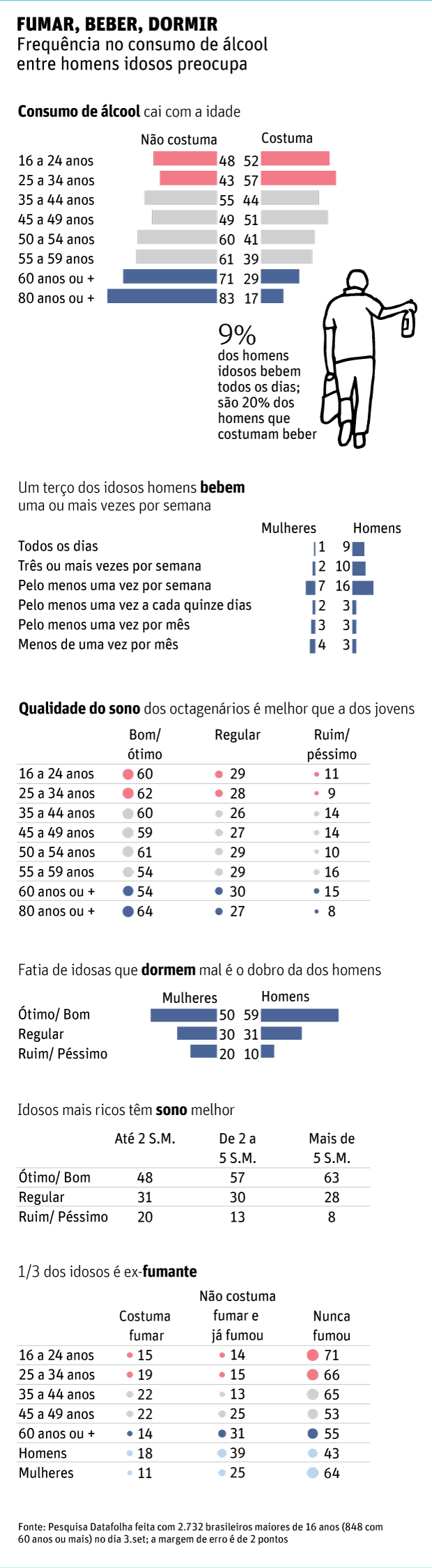 Pesquisa Datafolha inédita mostra que quase um em cada dez homens idosos brasileiros (9%) bebe todos os dias, cinco vezes a média do país (2%) e o dobro do percentual de beberrões (4%).