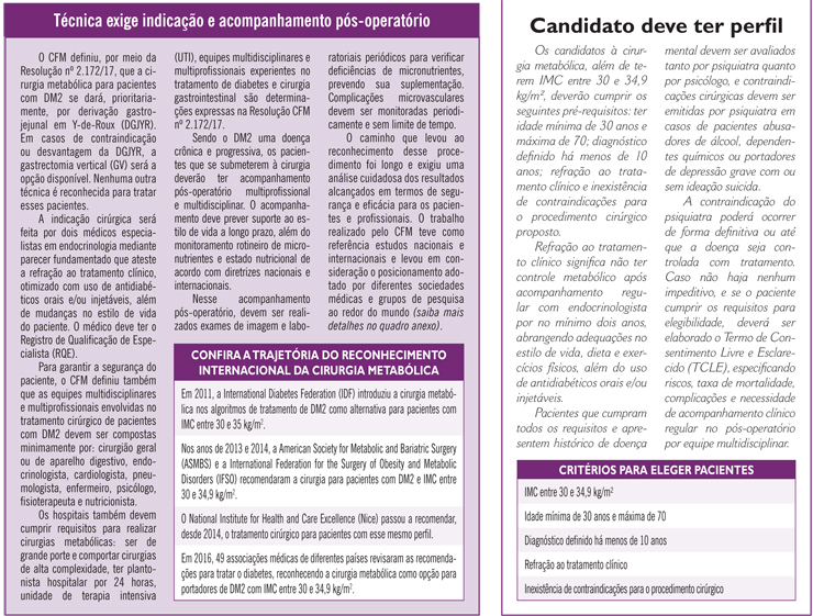 A cirurgia metabólica foi reconhecida como opção terapêutica para pacientes portadores de diabetes mellitus tipo 2 (DM2) com índice de massa corpórea (IMC) entre 30 e 34,9 kg/m2, desde que a enfermidade não tenha sido controlada com tratamento clínico. A decisão foi tomada com a aprovação da Resolução nº 2.172/17 pelo Conselho Federal de Medicina (CFM).