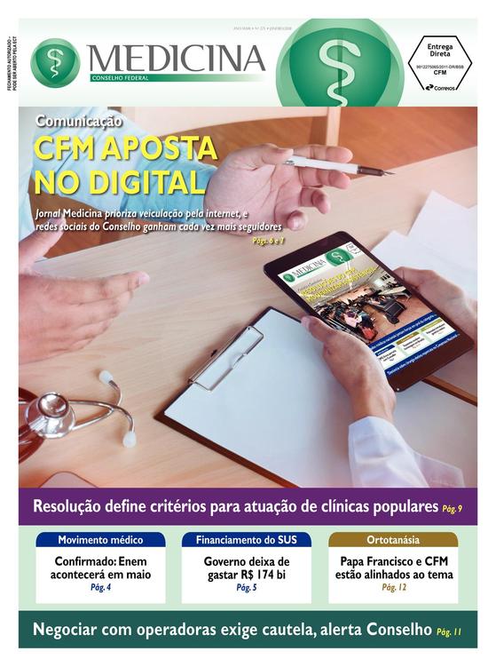 Desde janeiro deste ano, o jornal Medicina, do Conselho Federal de Medicina (CFM), será oferecido somente em versão digital. “A medida tem motivação ambiental e orçamentária e visa modernizar a comunicação da autarquia com os médicos brasileiros”, explica o presidente do CFM, Carlos Vital.