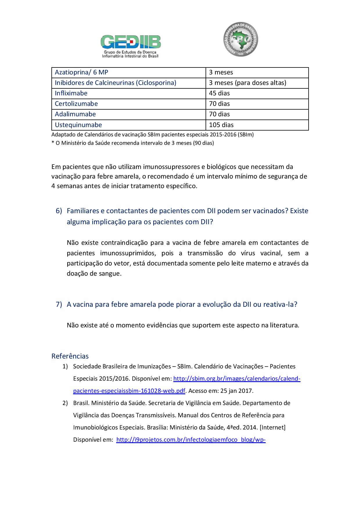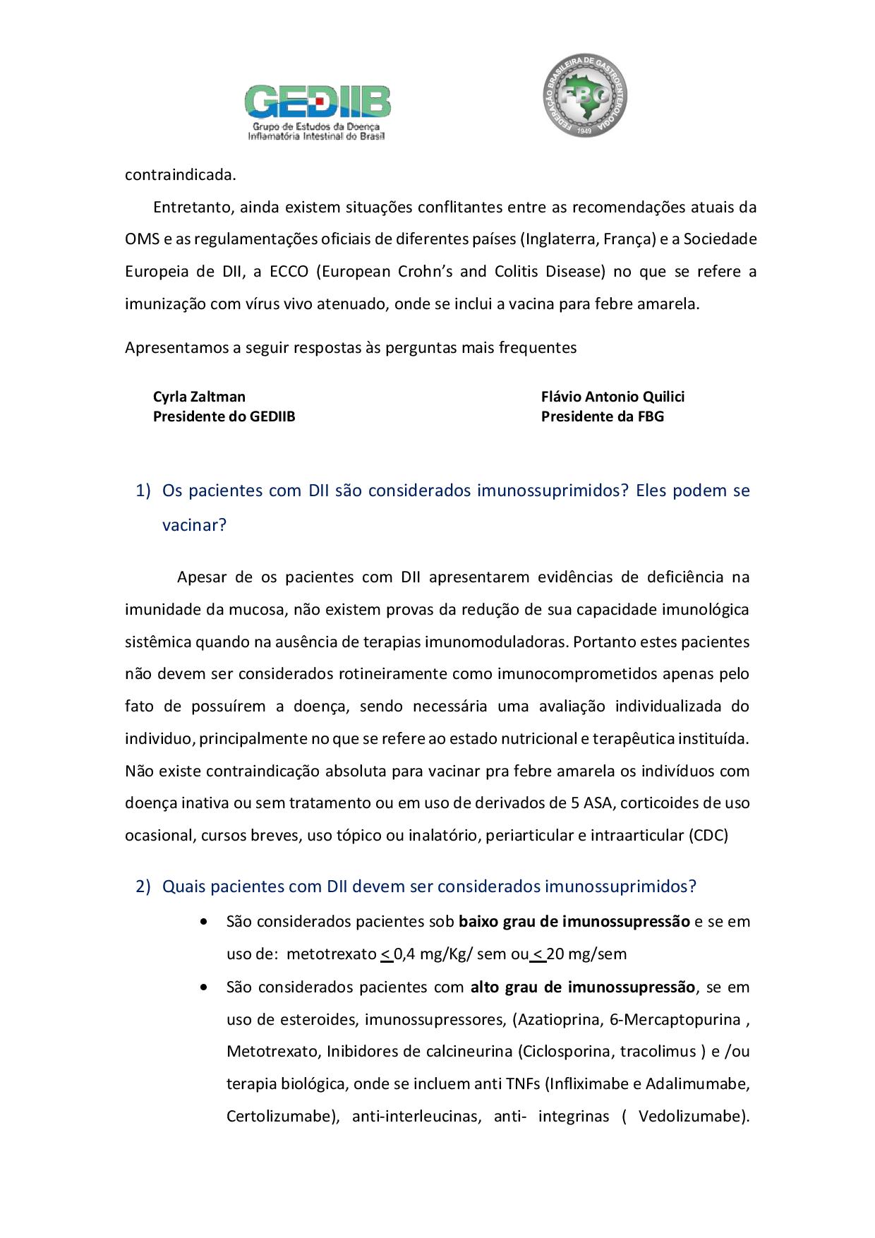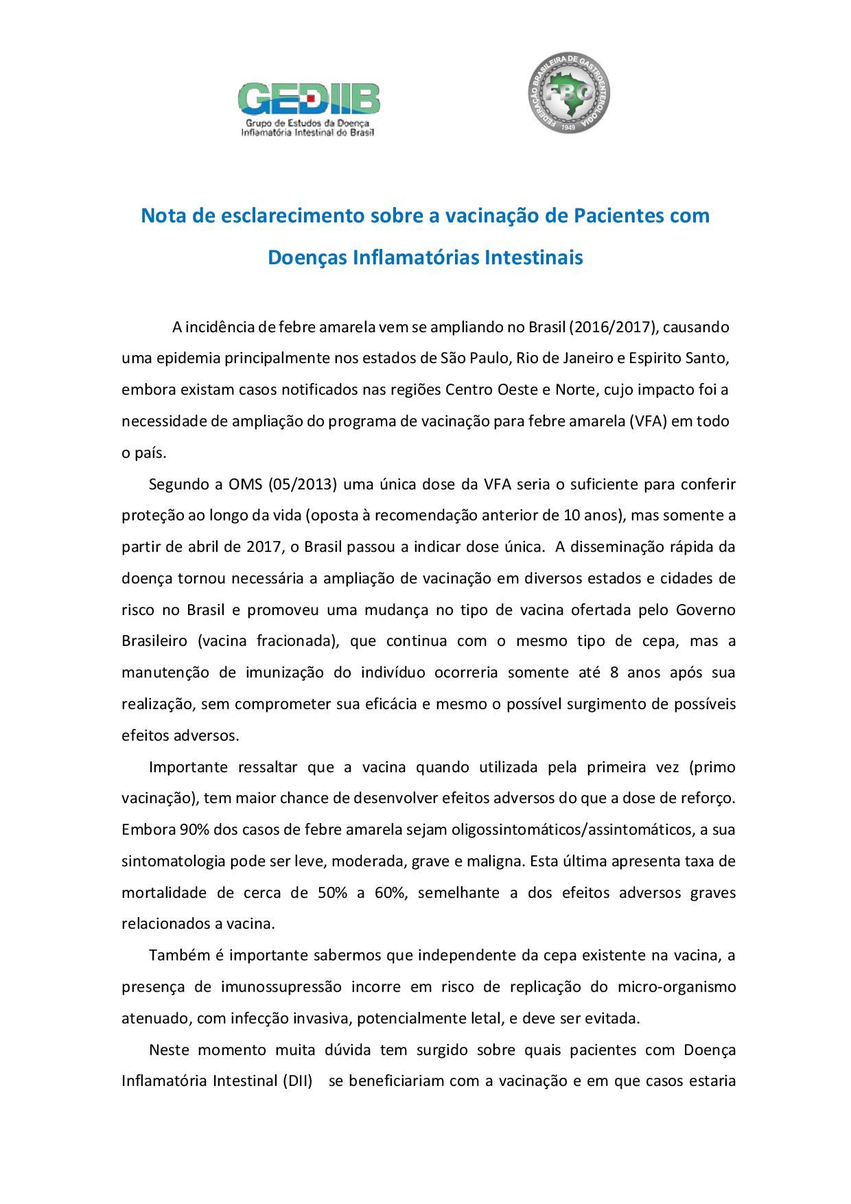 Nota de esclarecimento sobre a vacinação de Febre Amarela em pacientes de DII