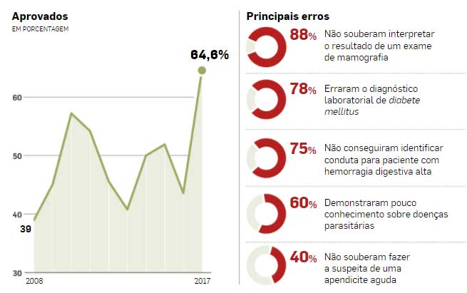 Os resultados se referem ao exame realizado no ano passado, quando 64,6% dos novos médicos passaram e 35,4% foram reprovados.