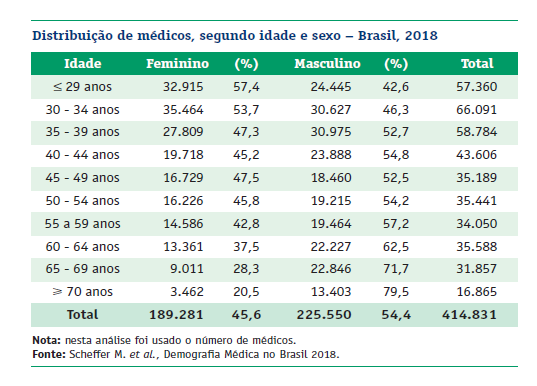 A Demografia Médica 2018 indica que o crescimento da população médica vem sendo acompanhado de uma mudança no perfil de idade e de gênero desse grupo, acentuando-se processos de feminização e de juvenização da categoria no Brasil. No entanto, os dados demográficos acentuam a rapidez com que o tamanho desse grupo vem aumentando.