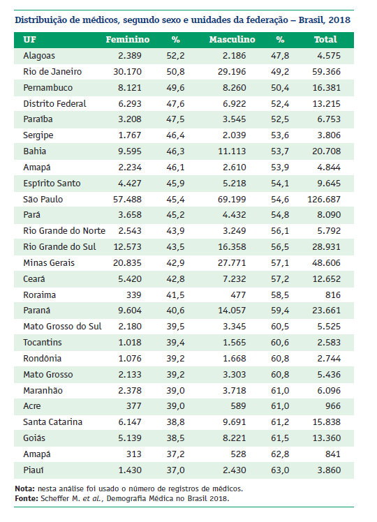 Dentre os estados, a ultrapassagem das mulheres médicas sobre os homens já se consolidou apenas em dois estados: no Rio de Janeiro, onde somam 50,8% dos profissionais, e em Alagoas, com 52,2%. Além deles, o percentual também é alto em Pernambuco (49,6%), Distrito Federal (47,6%) e Paraíba (47,5%). Em São Paulo, as médicas são 45,4% do total e em Minas Gerais, 42,9%. Em contrapartida, o Piauí tem a menor presença feminina, com 37%. Essa tendência também surge no Amapá (37,2%), Goiás (38,5%) e Santa Catarina, com 38,8%.