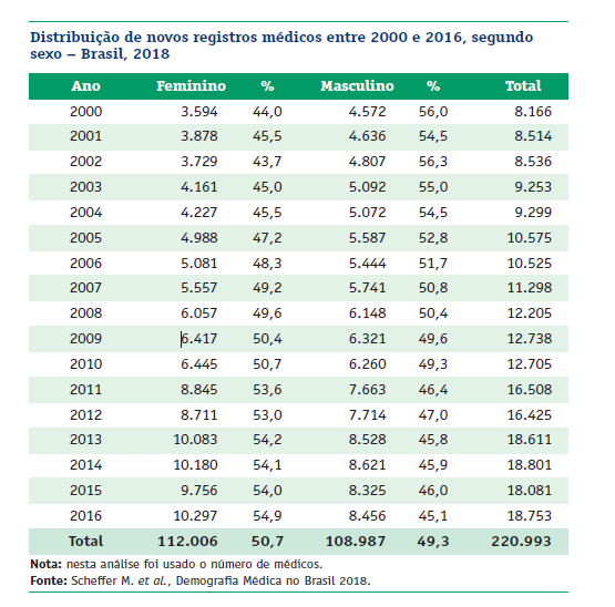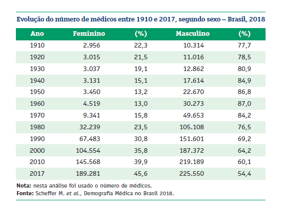 Quando se observa a série histórica da população de médicos segundo sexo, as mulheres representavam 22,3% e 21,5%, respectivamente em 1910 e 1920. Nos anos seguintes, este percentual oscilou para menos, chegando a 13%, em 1960. No entanto, a partir de 1970 essa proporção tem crescido de modo constante, subindo para 23,5%, em 1980; 30,8%, em 1990; 35,8% em 2000; e 39,9%, em 2010.