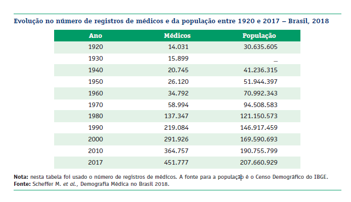 De 1920 a 2017, o total de registros de médicos no País saltou de 14.031 para 451.777 (crescimento de 2.219,8%). No mesmo período, a população foi de 30.635.605 para 207.660.929 habitantes (aumento de 577,8%). Pelos dados, ao longo de 97 anos o total de médicos cresceu 3,7 vezes mais que o da população em geral. No entanto, esse fenômeno se acentuou nas últimas décadas. De 1970 até a atualidade, o total de profissionais da medicina cresceu 665,8%, ou 7,7 vezes. Por sua vez, a população brasileira aumentou 119,7%, ou 2,2 vezes.