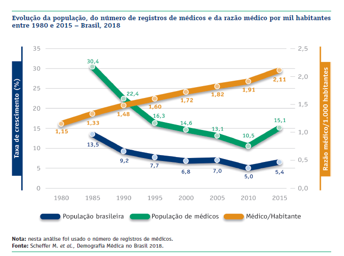 O Brasil contava, em janeiro de 2018, com 452.801 médicos, o que dá uma razão de 2,18 médicos por mil habitantes. Em 2010, quando foi elaborado o primeiro estudo de Demografia Médica, a razão de médicos por habitante era menor (1,91 por grupo de mil). Naquele período, 16.058 deixaram a faculdade e ingressaram no sistema de saúde. Há dois anos, em 2016, esse número chegou a 18.753. Porém, a tendência é que ele aumente muito mais, devendo chegar a mais de 28 mil, em 2024.