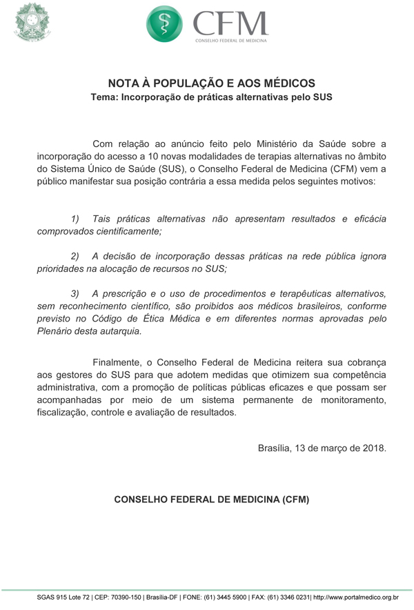 As chamadas práticas integrativas e complementares – que receberam o incremento de mais dez modalidades pelo Ministério da Saúde nessa semana – “não apresentam resultados e eficácia comprovados cientificamente”. A avaliação é do Conselho Federal de Medicina (CFM), expressa por meio de nota divulgada à imprensa e à sociedade nesta terça-feira (13).