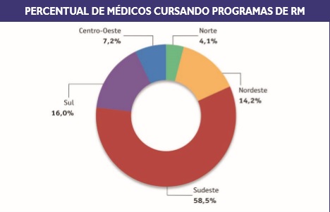 Por sua vez, a região Sul tem 5.631 residentes, equivalentes a 16% do total nacional. O Nordeste reúne 14,2%, o Centro-Oeste, 7,2%, e o Norte tem o menor grupo de residentes – 1.449, ou 4,1% –, a maioria deles em programas de dois anos de duração (R1 e R2). Somados, Sudeste e Sul reúnem praticamente três quartos de todas as vagas de RM do País.