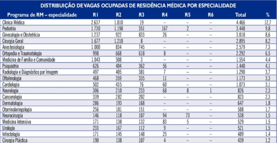 Aproximadamente 40% das vagas de Residência Médica (RM) e, portanto, de médicos residentes, estão concentradas em quatro especialidades: clínica médica, pediatria, cirurgia geral, e ginecologia e obstetrícia. Cabe ressaltar que clínica médica é pré-requisito para RM em outras 12 especialidades, e cirurgia geral, para 10.