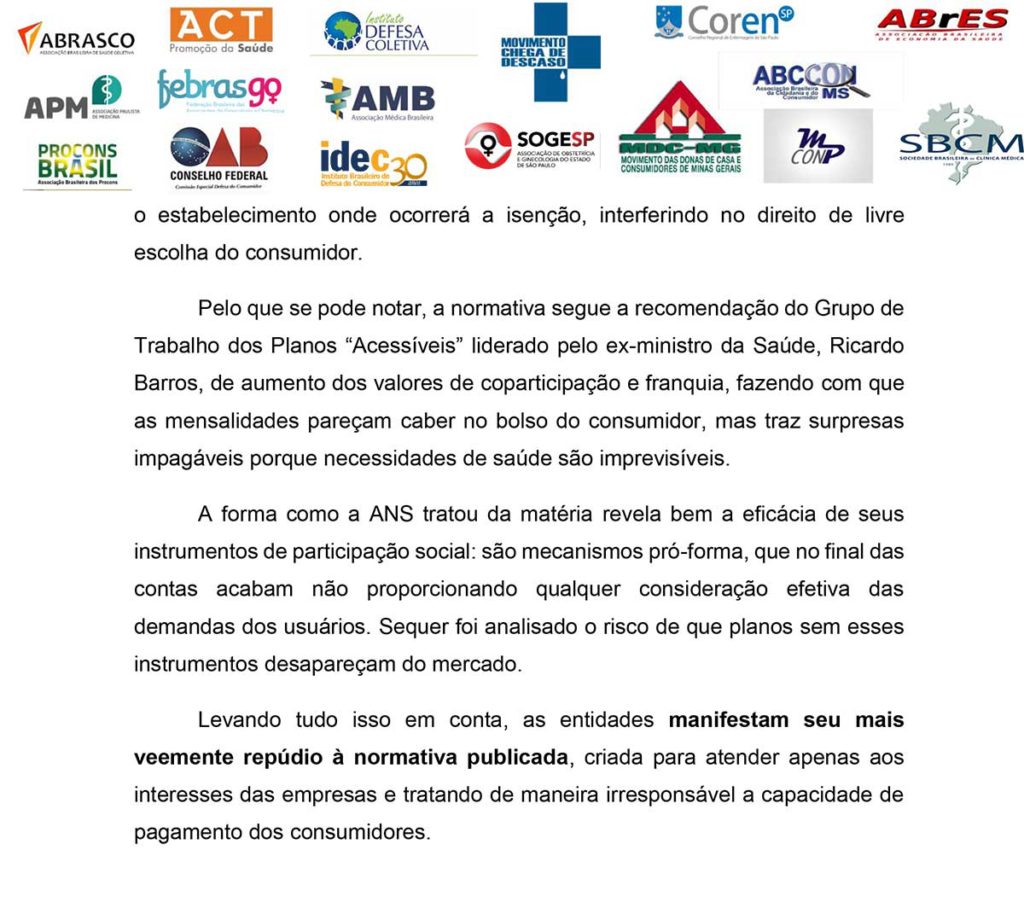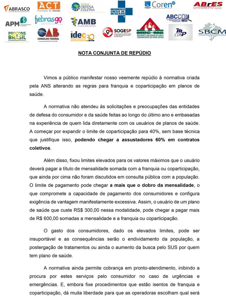 Nota conjunta de repúdio: franquia e coparticipação
