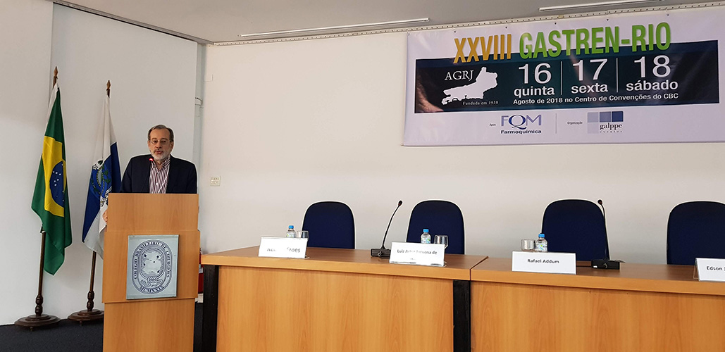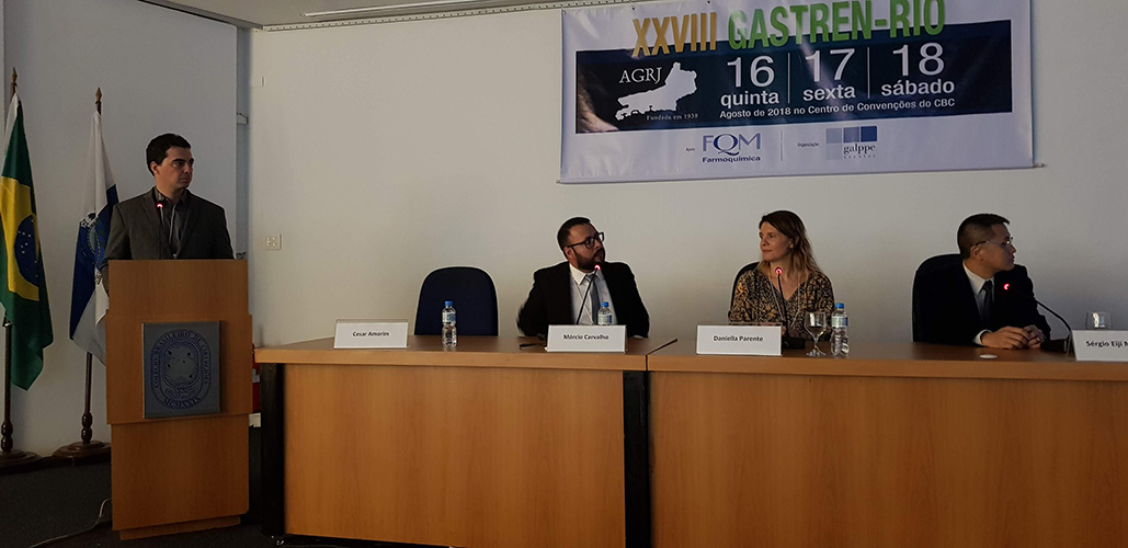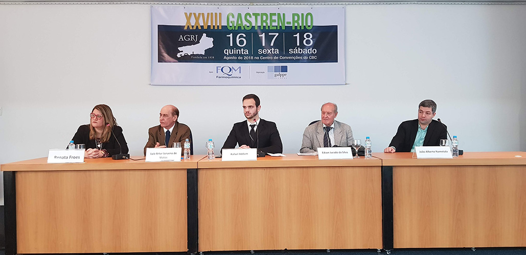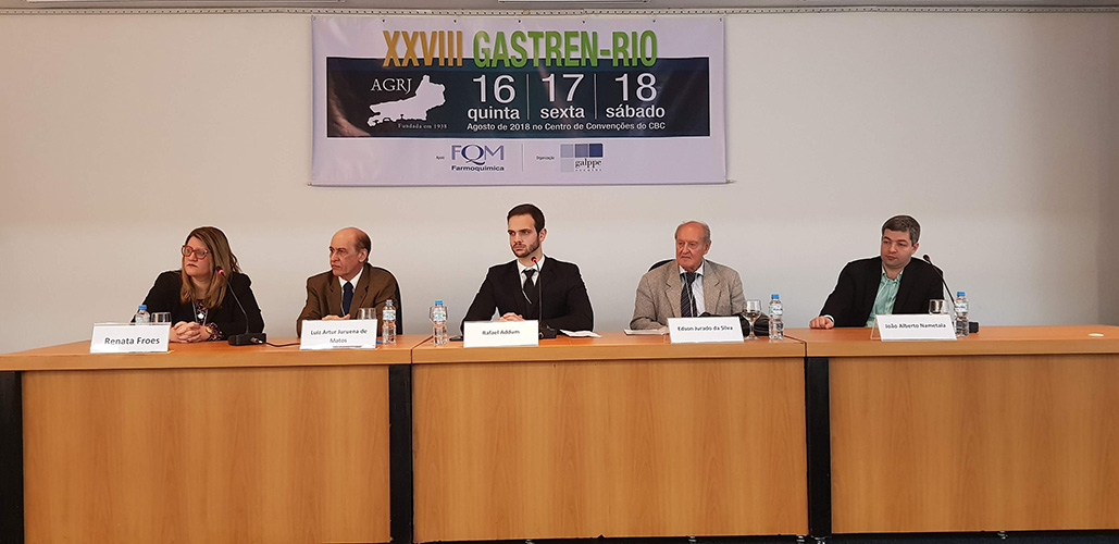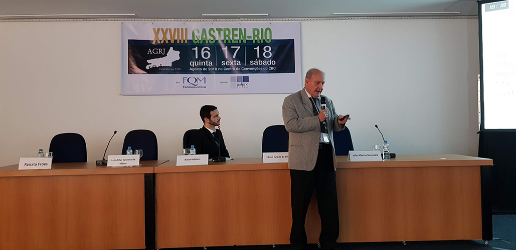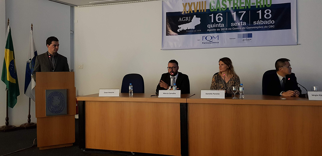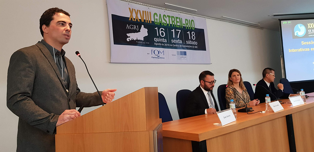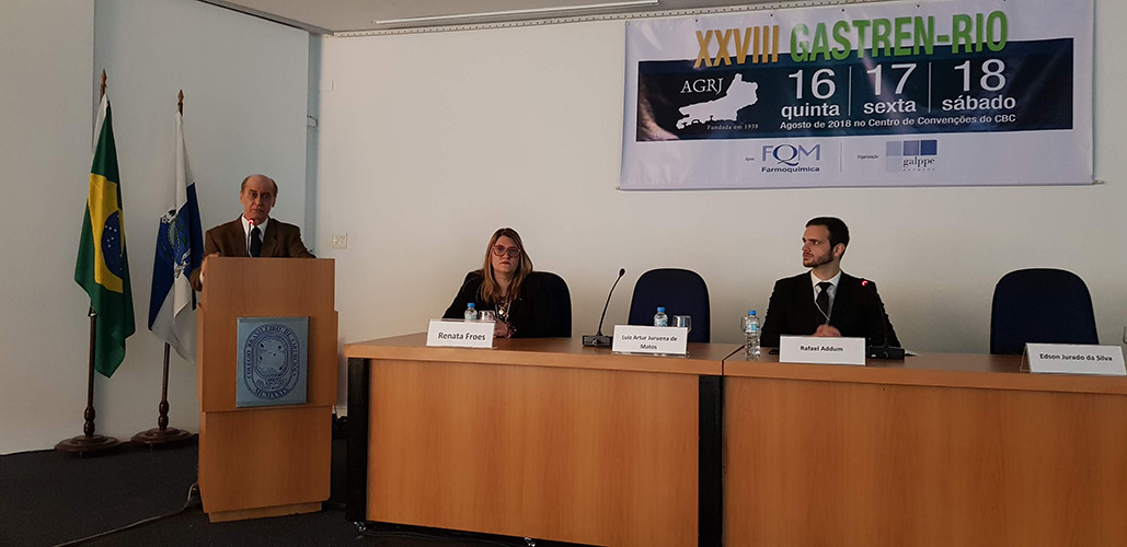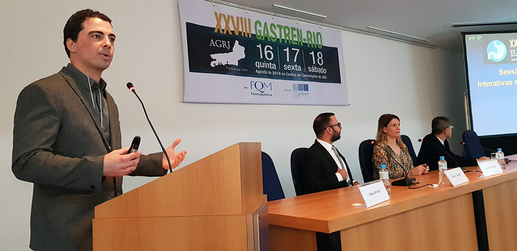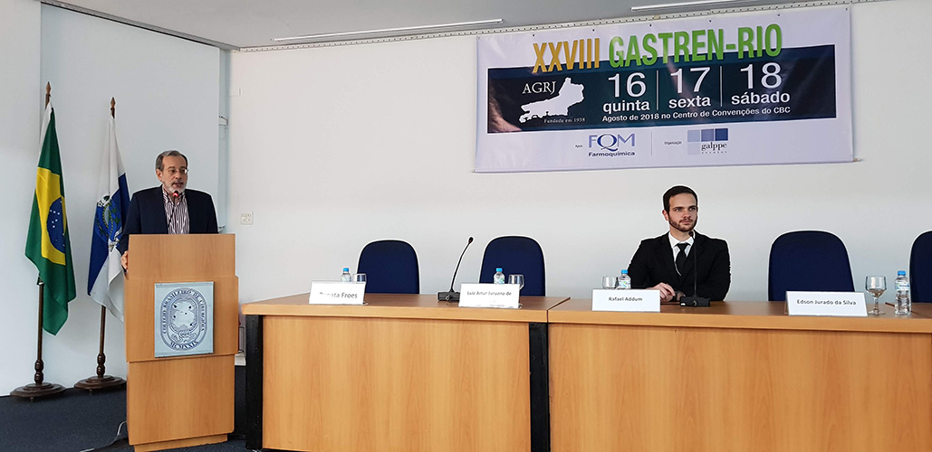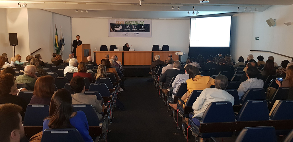 Dr. Antônio José Carneiro, presidente da AGRJ, deu início ao último dia do Gastren-Rio que celebra os 80 anos da sociedade dando as boas vindas aos presentes e falando sobre uma pequena mudança na programação já que a Dra. Maria do Carmo Friche Passos teve um problema pessoal e não pode comparecer ao evento. Ele falou ainda sobre a importância do programa Jovem Gastro, da FBG, um trabalho iniciado pelo Dr. Silvando Barbalho e chamou o Dr. Rafael Addum, residente de gastroenterologia do Hospital Universitário Clementino Fraga Filho (HUCFF), para presidir uma série de mini-conferências, que contou com palestras do Dr. Edson Jurado (Câncer colorretal – como prevenir?), do Dr. João Nametala (Cirurgia bariátrica – o que o Gastroenterologista deve saber?) e da Dra. Renata Fróes e do Dr. Luiz Artur Juruena de Matos (Análise Crítica do IV Consenso Brasileiro em Infecção pelo Helicobacter pylori). Após as mini-conferências, os apresentadores responderam questões da plateia.