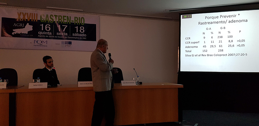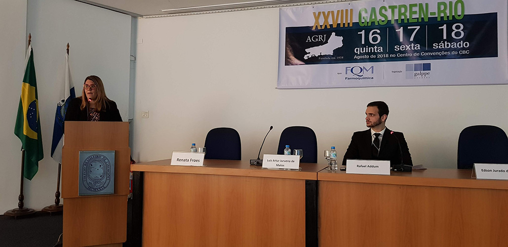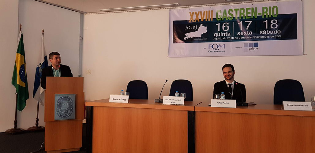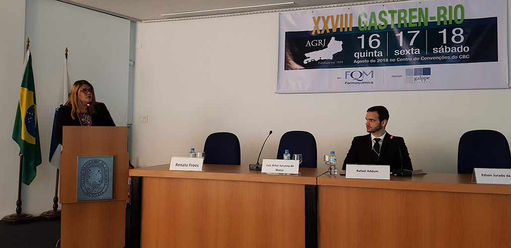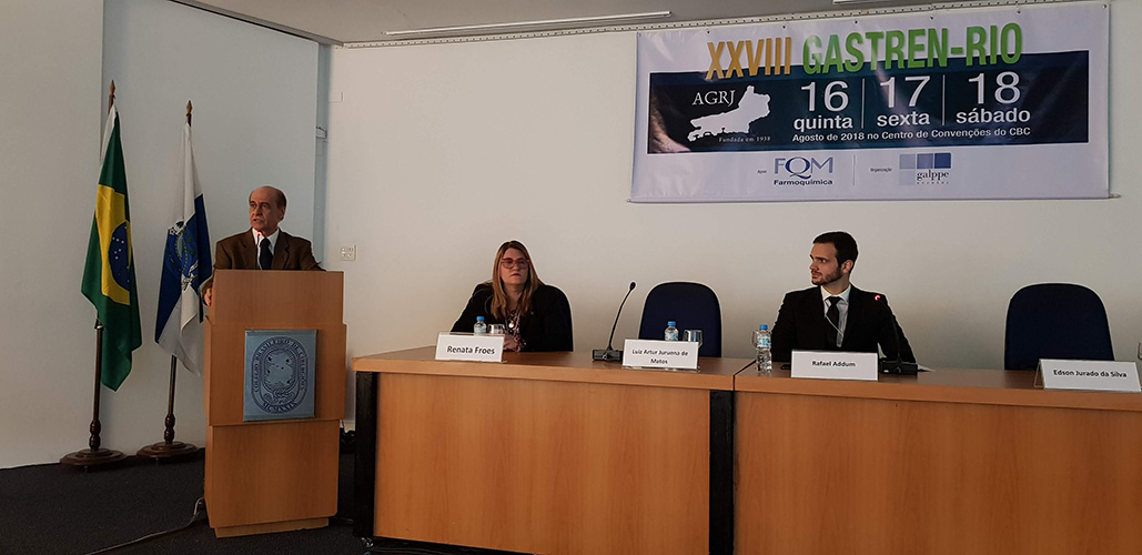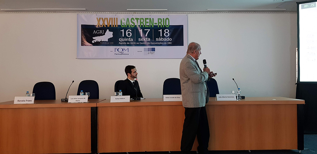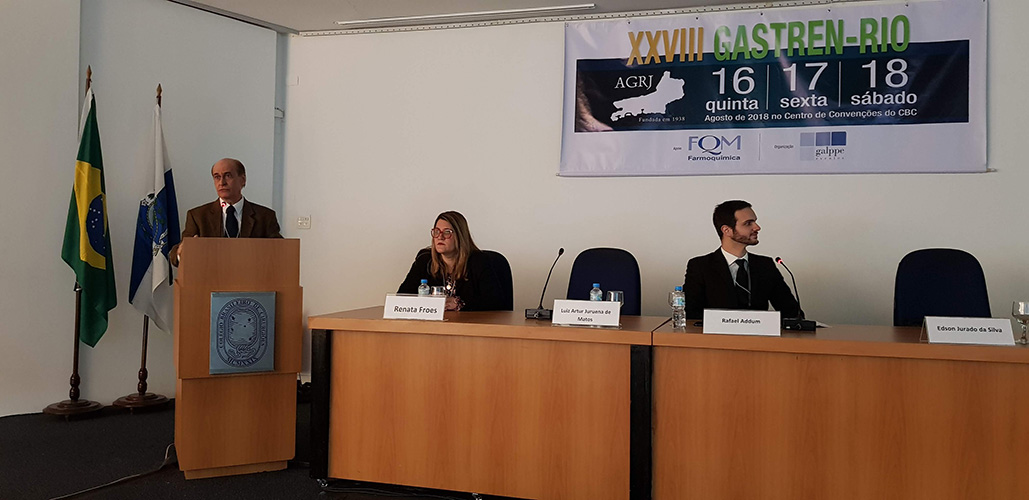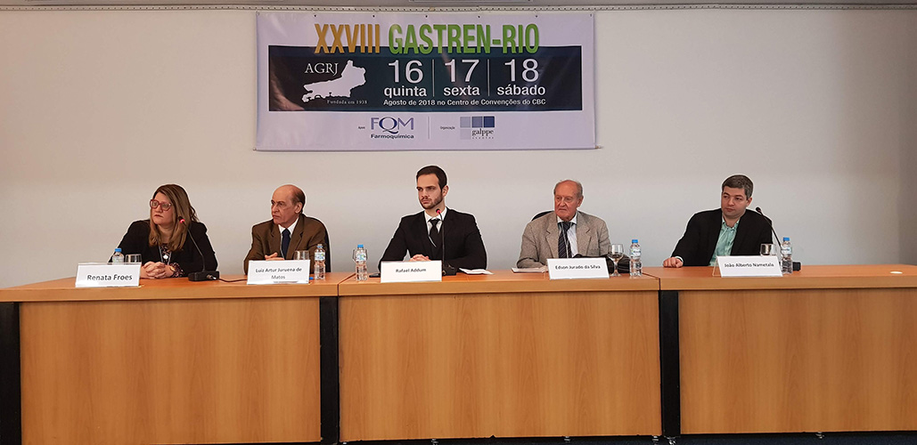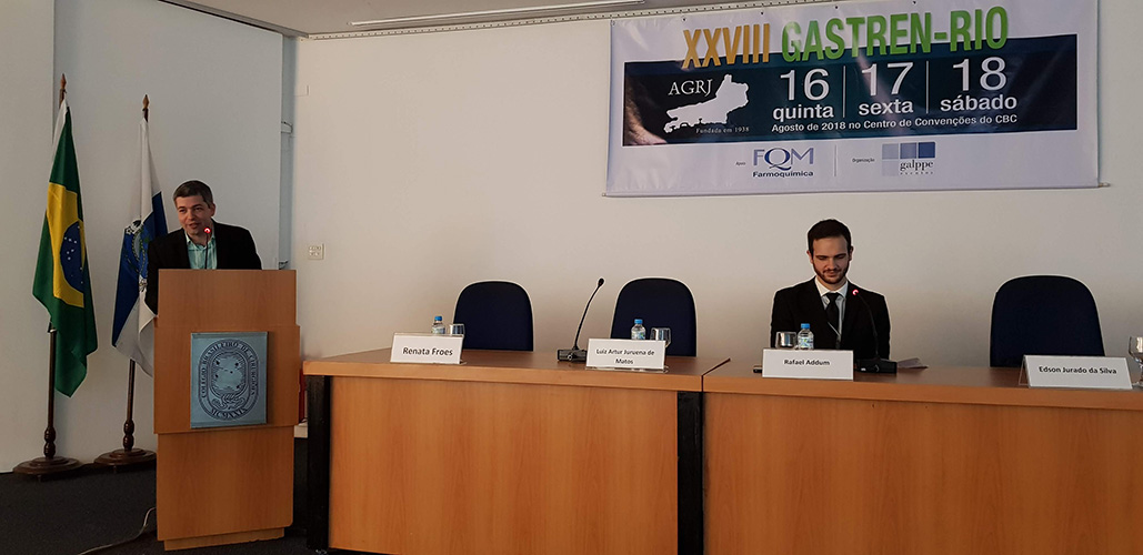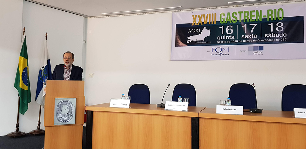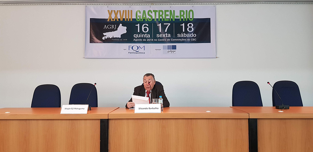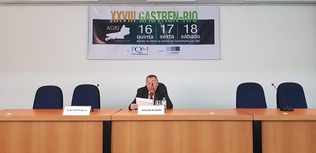 Dr. Antônio José Carneiro, presidente da AGRJ, deu início ao último dia do Gastren-Rio que celebra os 80 anos da sociedade dando as boas vindas aos presentes e falando sobre uma pequena mudança na programação já que a Dra. Maria do Carmo Friche Passos teve um problema pessoal e não pode comparecer ao evento. Ele falou ainda sobre a importância do programa Jovem Gastro, da FBG, um trabalho iniciado pelo Dr. Silvando Barbalho e chamou o Dr. Rafael Addum, residente de gastroenterologia do Hospital Universitário Clementino Fraga Filho (HUCFF), para presidir uma série de mini-conferências, que contou com palestras do Dr. Edson Jurado (Câncer colorretal – como prevenir?), do Dr. João Nametala (Cirurgia bariátrica – o que o Gastroenterologista deve saber?) e da Dra. Renata Fróes e do Dr. Luiz Artur Juruena de Matos (Análise Crítica do IV Consenso Brasileiro em Infecção pelo Helicobacter pylori). Após as mini-conferências, os apresentadores responderam questões da plateia.