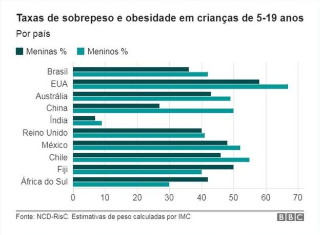 No Brasil, 36% das meninas está acima do peso ou obesa, enquanto 16% estão abaixo do peso ideal.
