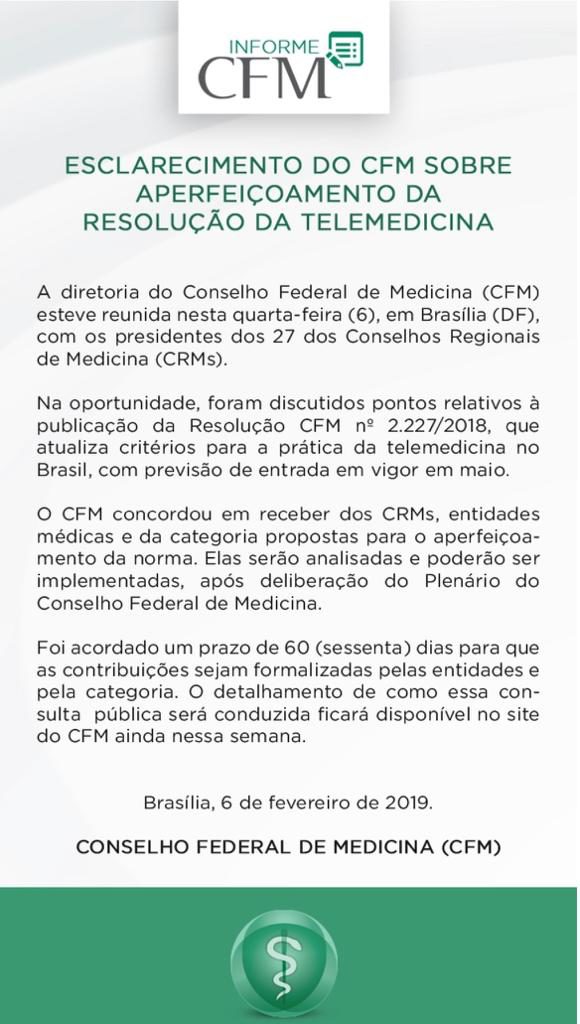 CFM solta nota oficial sobre resolução abordando telemedicina. Confira!