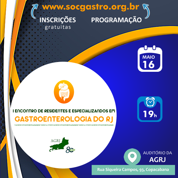 Já estão abertas as inscrições para o I Encontro de Residentes e Especializandos em Gastroenterologia do Rio de Janeiro, que será realizado no dia 16 de maio, quinta-feira, das 19h às 22h, no auditório da AGRJ, em Copacabana.