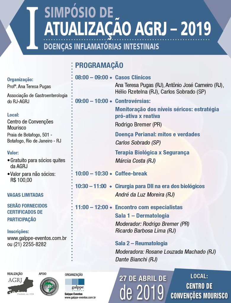 O I Simpósio de Atualização da AGRJ em 2019 ocorrerá neste sábado, dia 27, das 8h às 12h, no Centro de Convenções Mourisco, em Botafogo.