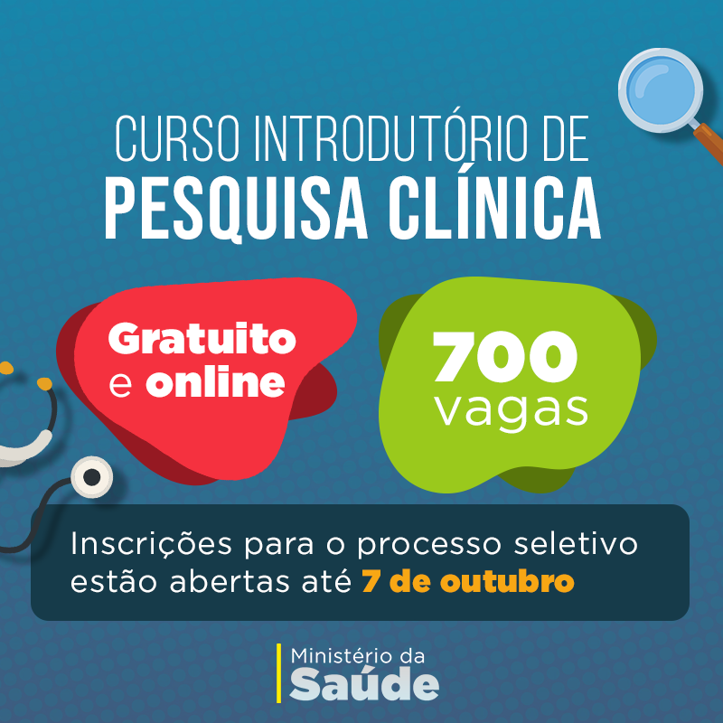 O Ministério da Saúde está com inscrições abertas para o Curso Introdutório de Pesquisa Clínica, voltado para estudantes de graduação e profissionais da área de saúde.