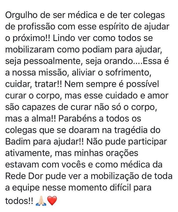 Bom Dia amigos, gostaria de dar aqui o meu testemunho, entrei no centro cirúrgico do Badim ontem às 14h, em torno de 17:45, no decorrer da cirurgia que auxiliava, fomos informados de fogo no prédio antigo e por isso, deveríamos evacuar imediatamente o centro cirúrgico. Eu já havia visto isso em filmes, mas nunca pude imaginar que algo parecido poderia ocorrer comigo. Eu, 3 funcionários do hospital e a anestesista colocamos a paciente ainda intubada numa preencha, só deu tempo de pegar uma bala de O2, um ambu e descer os 4 andares pela escada ventilando na mão. Na rua, conseguimos entubar a paciente que foi transferida para o Rios D’Or. No caminho dos andares me impressionou a capacidade de mobilização dos funcionários para o resgate de todos os pacientes. Se não fosse por eles, imagino uma tragédia maior. Havia um direcionamento muito eficaz agrupando os pacientes no quarto 223 que dava acesso às escadas laterais do prédio anexo. Isso gerou um fluxo ordenado de saída. Por conta dessa sinalização, não vi ninguém perdido pelos corredores, o que deve ter salvado muitas vidas. Utilizando essa escada externa, consegui subir outras 5 vezes descendo com pacientes que estavam sem possibilidade de caminhar, um deles da rpa ainda sob efeito de raquianestesia. Não foi fácil, pois devido ao peso, eram necessárias no mínimo 6 pessoas para descer cada paciente com segurança. Felizmente, com o grupo de funcionários ali presente fomos capazes de descer o máximo de pacientes possível, até que os bombeiros chegassem. Não havia fogo, mas a fumaça quente se formou muito rápido e em minutos não era possível enxergar. Eu particularmente fico sentido por não conseguir ter feito mais, eu vi ao menos 7 leitos com pacientes em ventilação mecânica que não conseguimos retirar a tempo até que os bombeiros impedissem nossa subida devido ao risco inalatório. A partir daí somente eles com máscaras de oxigênio eram capazes de acessar o prédio. Não sou funcionário da rede, apenas um cirurgião que estava operando no momento do incidente. A meu ver, se não fossem a garra e organização dos funcionários para salvar o máximo de pacientes possível nos 45minutos cruciais (até a chegada dos bombeiros) imagino um tragédia muito pior. Na hora havia cerca de 200 funcionários e 100 pacientes, a capacidade de resgate desses 200 heróis foi algo sobre humano. Merecem o meu máximo respeito e admiração pelo comprometimento em não apenas cuidar, mas salvar vidas. Aos colegas da rede, diretoria do hospital e familiares de pacientes fica aqui meu sincero sentimento pelo ocorrido.