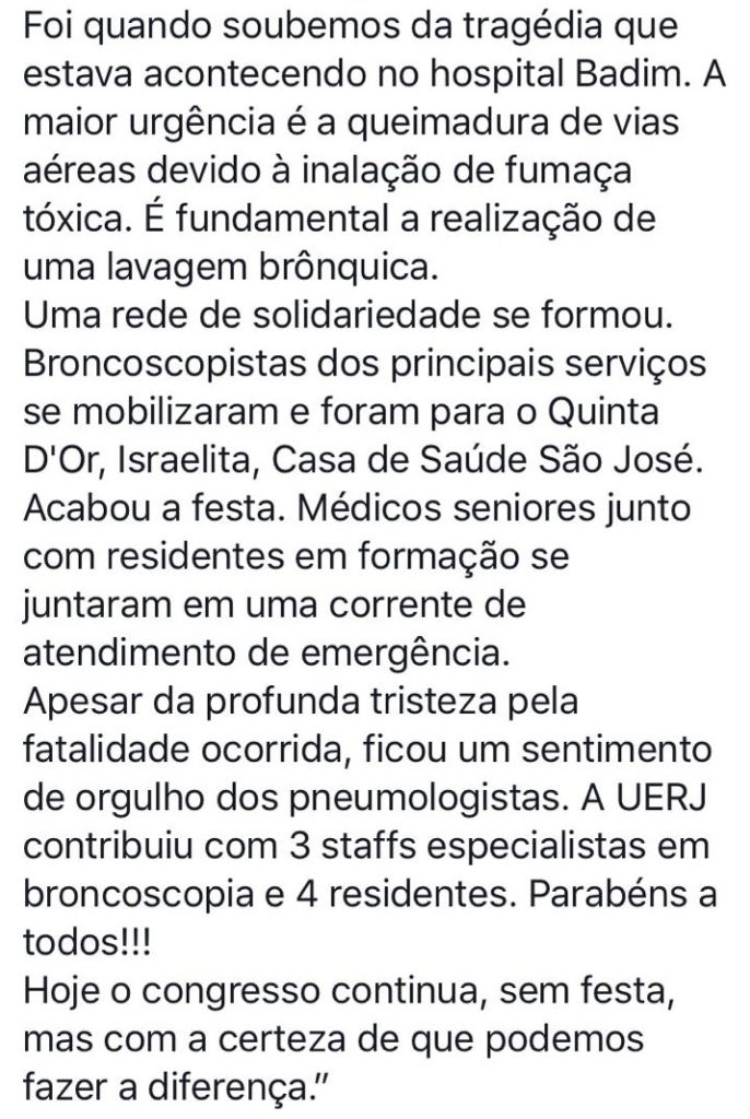 Loivos, Palermo, Vianna, Pantoja, Pottes, Ventura, Salles, Gabriel, Mariana, residentes de pneumologia e tantos outros talvez injustamente não citados lutaram juntos essa noite e seguem em atividade para tentar reduzir a dimensão da tragédia do Hospital Badim.