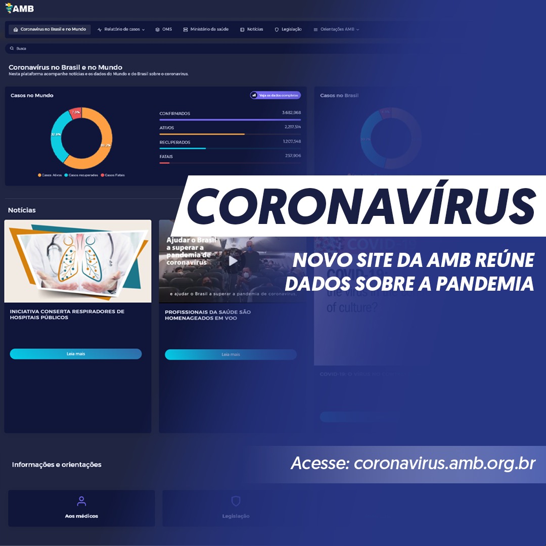 A AMB lançou na quinta-feira, dia 7, uma plataforma de dados sobre a COVID-19 no Brasil e no Mundo. No site é possível pesquisar informações sobre os casos por estado brasileiro. A plataforma foi pensada para reunir em um único lugar informações sobre a doença para gestores públicos e privados, médicos, profissionais da saúde e população em geral. Nos relatórios há o número de infectados, casos ativos, recuperados e taxa de letalidade.