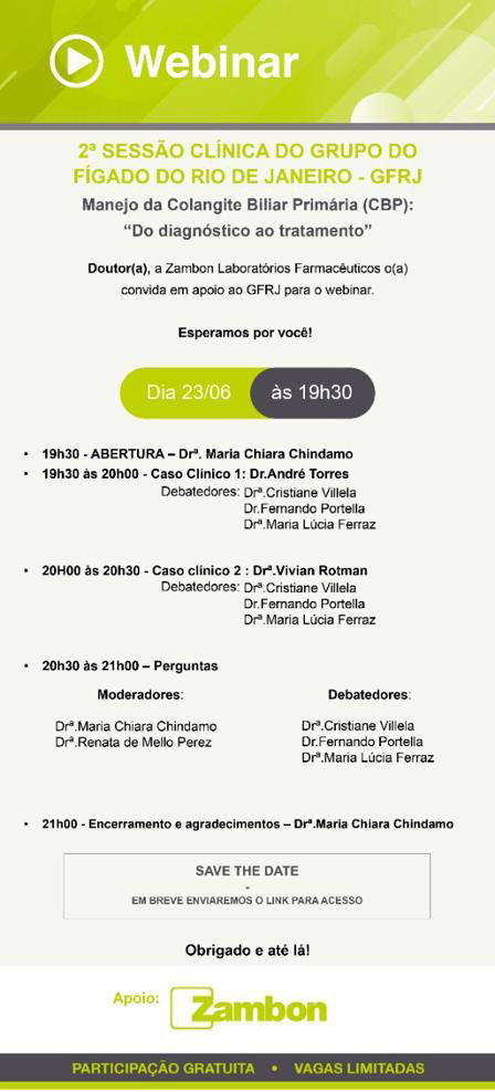 O Grupo de Fígado do Rio de Janeiro (GFRJ) realiza no dia 23 de junho, terça-feira, a 2ª Sessão Clínica, que abordará Manejo da Colangite Biliar Primária (CBP): do diagnóstico ao tratamento.