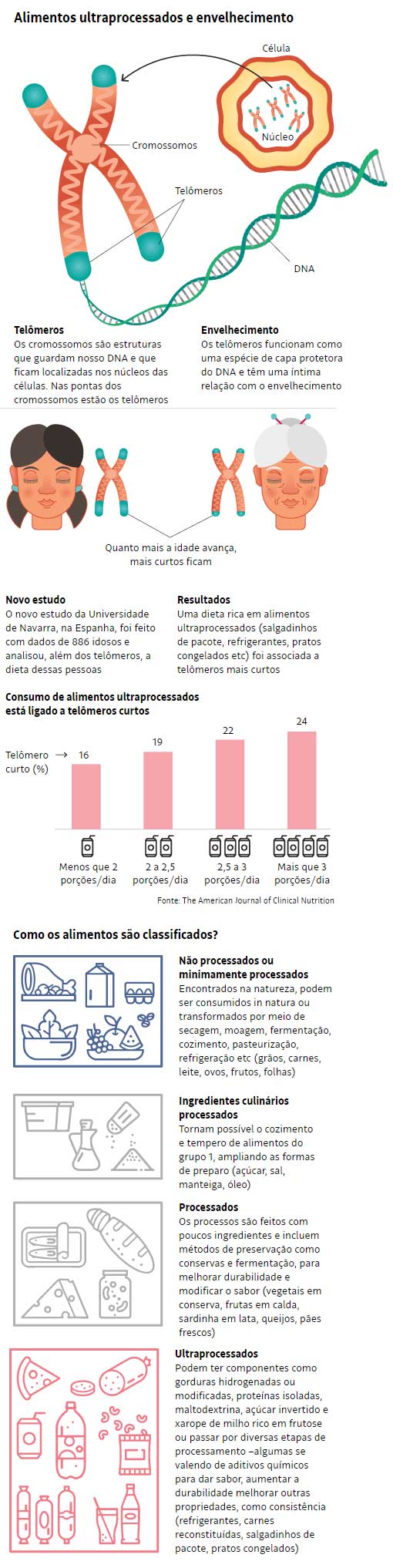 “Acreditamos que a associação observada entre o consumo de alimentos ultraprocessados e o risco de ter telômeros curtos pode ser explicada por maior ingestão de sal, gordura saturada e açúcar, bem como ingestão inadequadas de fibras e micronutrientes. Os participantes que consumiram uma quantidade maior desses alimentos em nossa coorte tiveram maior ingestão de […] carnes processadas e menor ingestão de fibras, potássio, fósforo, magnésio, cálcio, frutas e vegetais; e uma menor adesão ao padrão alimentar mediterrâneo”, escrevem os autores no estudo.