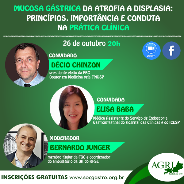 A Associação de Gastroenterologia do Rio de Janeiro (AGRJ) realiza nesta segunda-feira, dia 26, às 20h, webinar sobre Mucosa Gástrica da atrofia a displasia: princípios, importância e conduta na prática clínica.