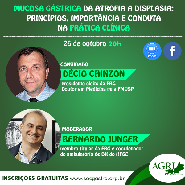 A Associação de Gastroenterologia do Rio de Janeiro (AGRJ) realiza no dia 26 (segunda-feira), às 20h, webinar sobre Mucosa Gástrica da atrofia a displasia: princípios, importância e conduta na prática clínica.