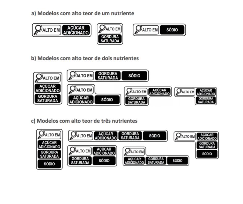 Para tal, foi desenvolvido um design de lupa para identificar o alto teor de três nutrientes: açúcares adicionados, gorduras saturadas e sódio. O símbolo deverá ser aplicado na frente do produto, na parte superior, por ser uma área facilmente capturada pelo nosso olhar. Confira os modelos: