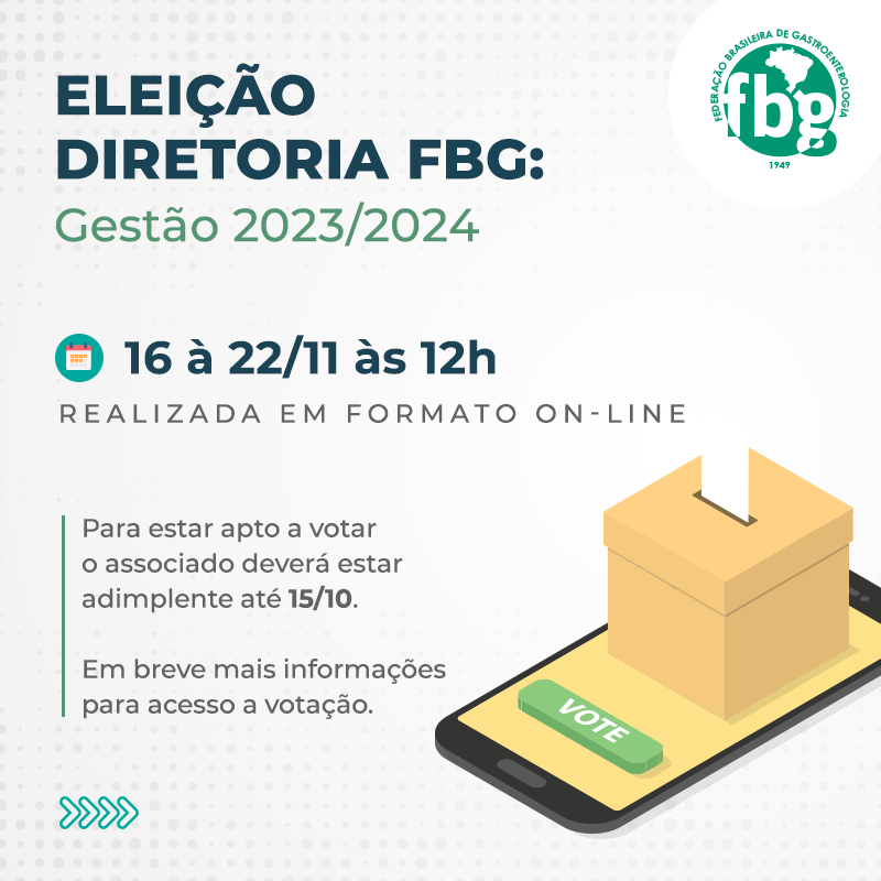 A Comissão Eleitoral Informa aos associados que a Chapa “Caminhando Juntos” foi inscrita para o pleito eleitoral para a Diretoria da FBG, mandato de 2023/2024, cuja votação eletrônica se realizará de 16 a 22 de novembro de 2020, nos termos do Edital de Convocação a ser publicado em breve.
