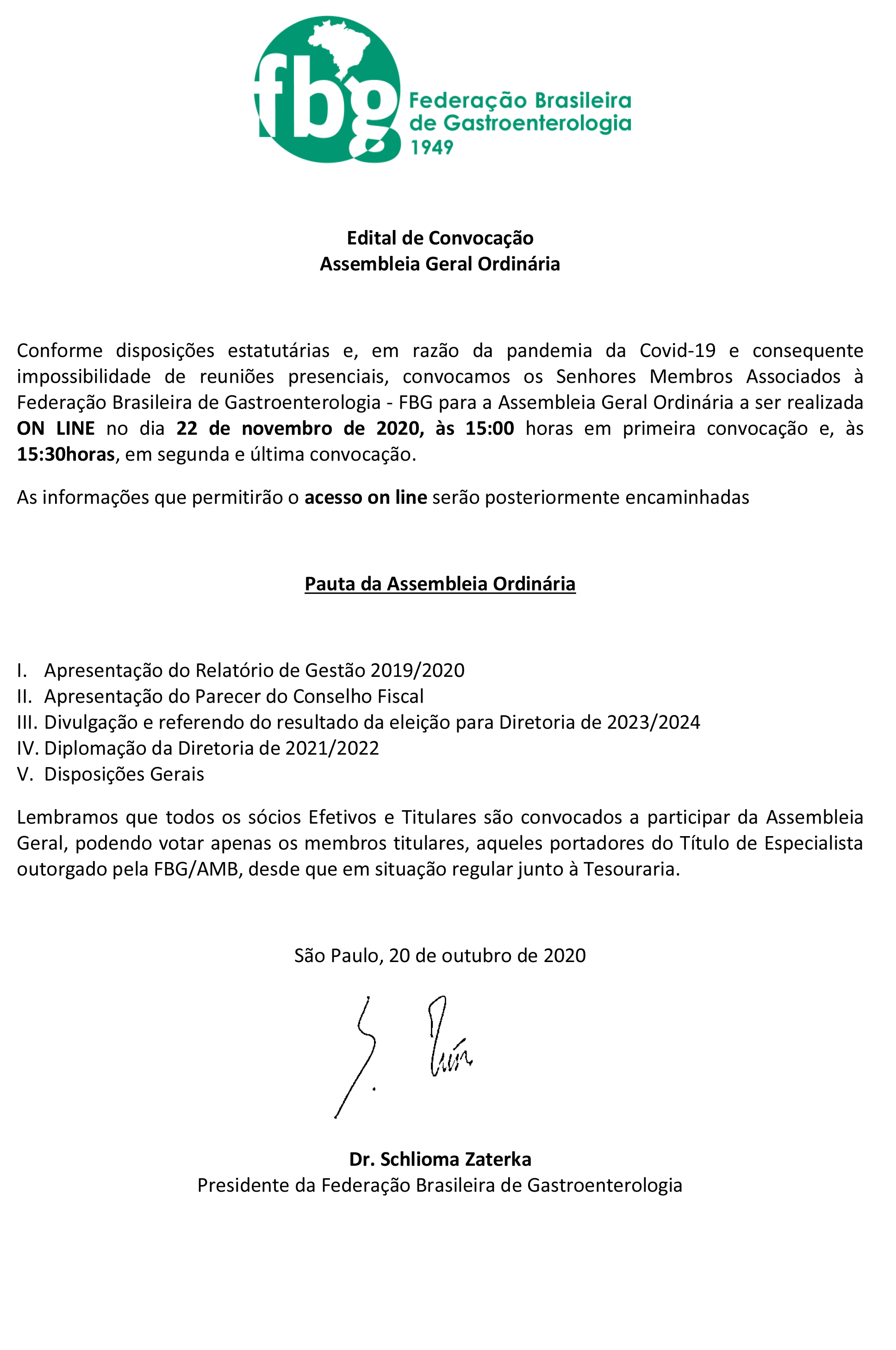 A Federação Brasileira de Gastroenterologia (FBG) convoca os sócios e titulares para Assembleia Geral Ordinária, que será realizada dia 22 de novembro, às 15h, no formato on-line – em razão da pandemia da COVID-19.