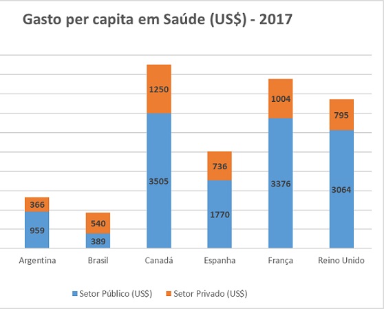 O restante foi gasto pelas das famílias, com serviços de saúde privados (incluindo planos de saúde) e compra direta de medicamentos. Nesses mesmos países, a participação pública no gasto total em saúde variou entre 70,6% (Espanha) e 79,4% (Reino Unido).