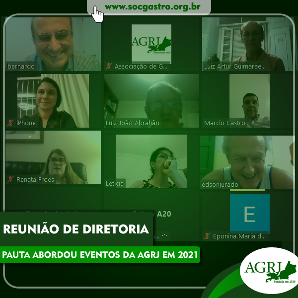 A diretoria da Associação de Gastroenterologia do Rio de Janeiro se reuniu, de forma virtual, na noite desta segunda-feira, dia 8. Na pauta, as atividades científicas a serem realizadas pela AGRJ em 2021.