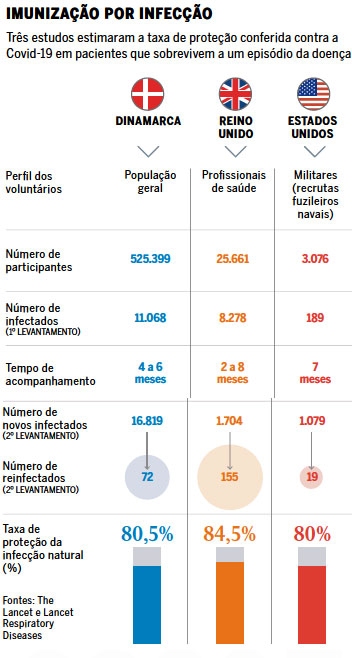 Três estudos independentes de EUA, Reino Unido e Dinamarca indicam que a proteção contra o coronavírus conferida pela infecção natural é de cerca de 80%. Esse número, similar à eficácia de algumas vacinas, é boa notícia para a construção de imunidade coletiva, mas os 20% de risco do outro lado da equação ainda preocupam especialistas.