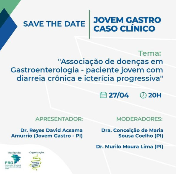O evento contará com a apresentação do Dr. Reyes David Acsama Amurrio (Jovem Gastro – PI) e moderação da Dra. Conceição de Maria Sousa Coelho (PI) e do Dr. Murilo Moura Lima (PI).