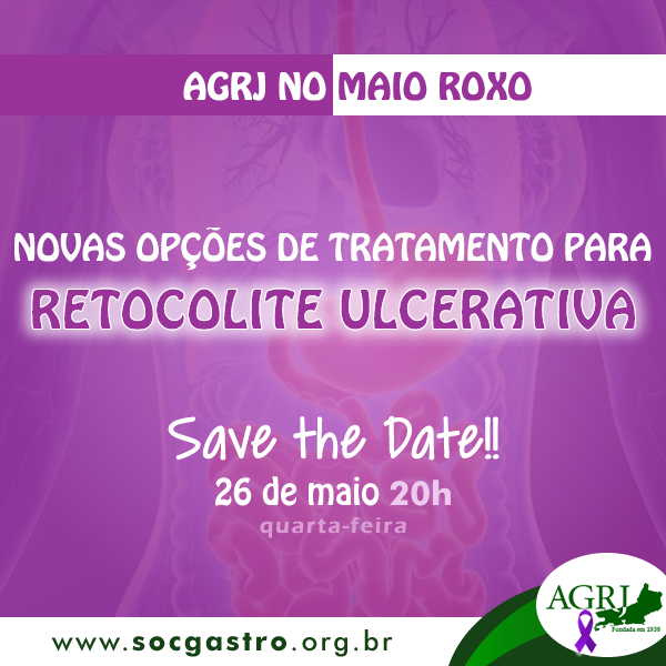 A Associação de Gastroenterologia do Rio de Janeiro realiza no dia 26 de maio, quarta-feira, a partir das 20h, webinar sobre Novas opções de tratamento para a Retocolite Ulcerativa. A ação faz parte da campanha AGRJ no Maio Roxo, que visa conscientizar a população sobre Doenças Inflamatórias Intestinais.