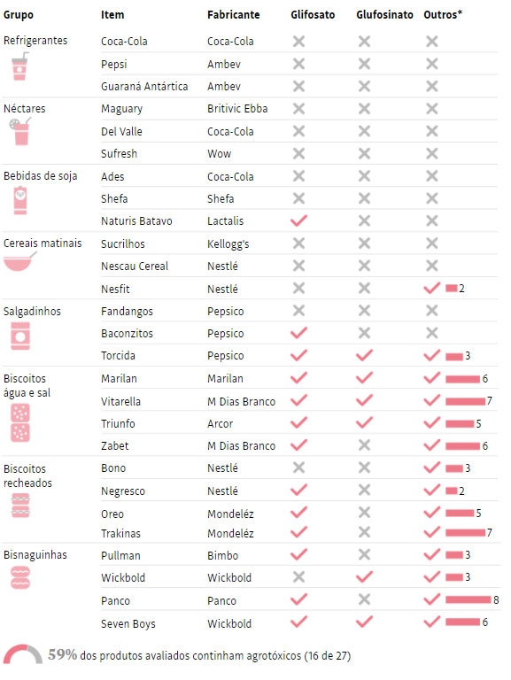 Entre as 27 amostras analisadas a pedido do Idec, em 8 categorias (refrigerantes, bebidas de soja, néctares, salgadinhos, cereais matinais, biscoito água e sal, biscoito recheado e bisnaguinhas), 16 apresentaram ao menos um resíduo de agrotóxico —59% do total. Nas categorias dos refrigerantes e dos néctares não houve nenhuma detecção.