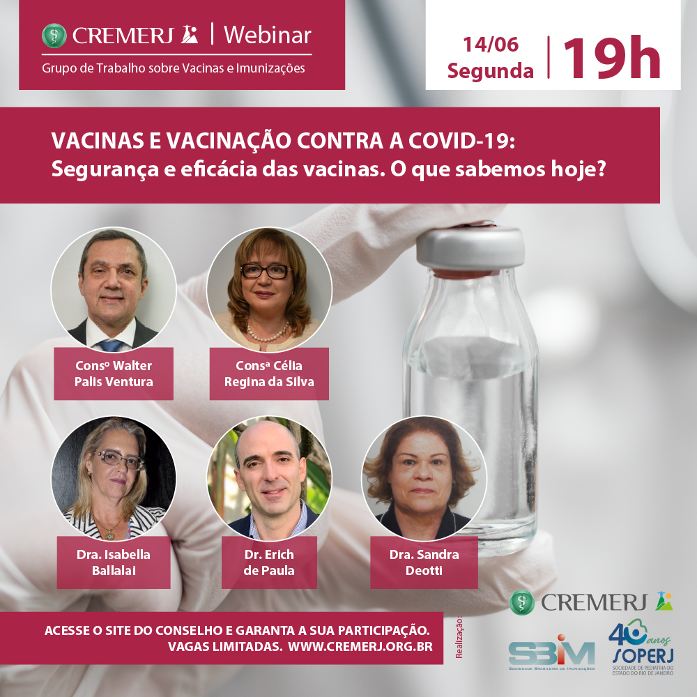 O Conselho Regional de Medicina do Estado do Rio de Janeiro (Cremerj) realiza nesta segunda-feira, dia 14, às 19h, webinar sobre “Vacinas e Vacinação contra a COVID-19: Segurança e eficácia das vacinas. O que sabemos hoje”.