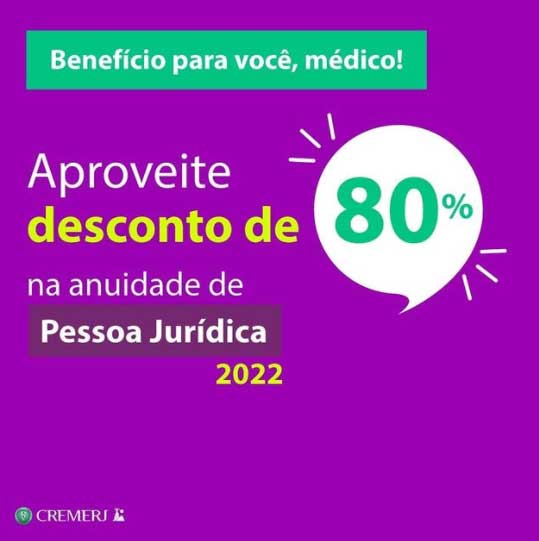 O formulário de solicitação do desconto de 80% na anuidade, concedido aos médicos registrados como Pessoa Jurídica, já está disponível no site do CREMERJ. O prazo de requerimento vai até 20 de janeiro de 2022 e o pagamento deve ser feito até o dia 31 do mesmo mês. Caso a data seja excedida, a empresa perde o benefício e passa a pagar o valor da integral.