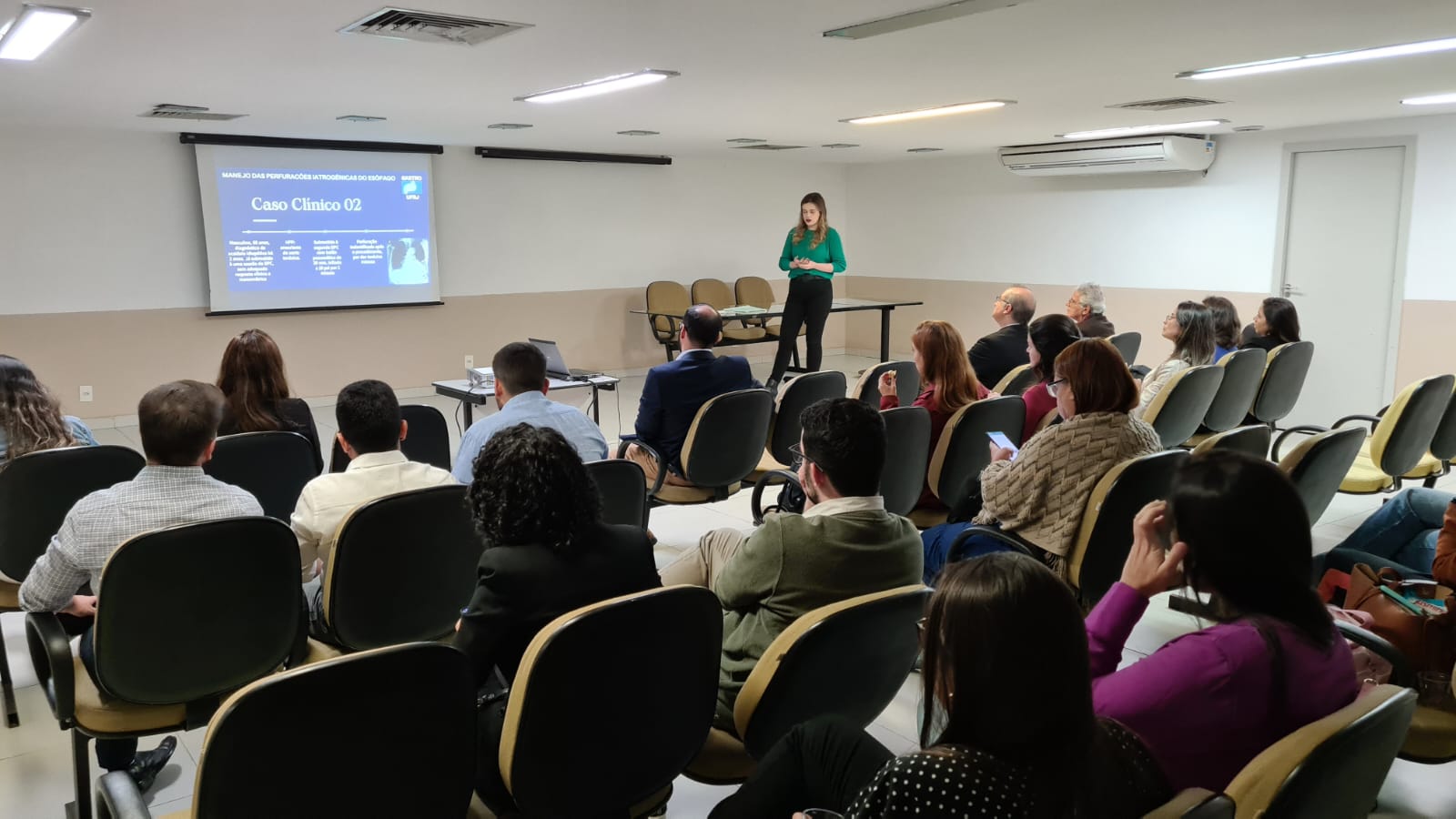 Após um breve intervalo para o café, o evento retornou com a palestra da Dra. Anna Luiza Alvarães, do Hospital Universitário Clementino Fraga Filho, que trouxe caso clínico sobre Manejo das perfurações do esôfago. Ao término da apresentação ela e o orientador, Dr. Marcio Carvalho, fizeram uma oficina mostrando método para terapia à vácuo.