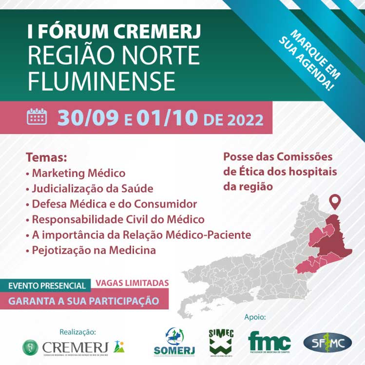 O I Fórum CREMERJ Norte Fluminense será realizado nos dias 30 de setembro e 1º de outubro, sexta-feira e sábado, respectivamente, no Anfiteatro Jair Araújo Jr., da Faculdade de Medicina de Campos, localizado na Av. Alberto Torres, 217, no Centro de Campos dos Goytacazes.
